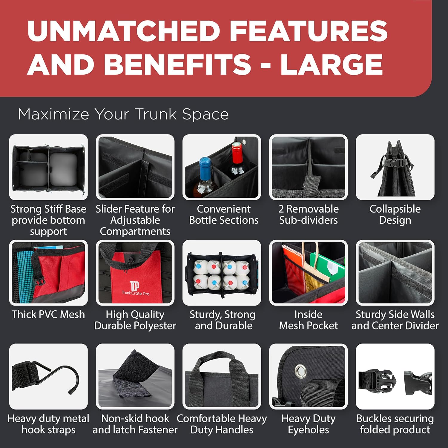 TRUNKCRATEPRO Red Car Accessories Trunk Organizer For Car, Suv Premium Multi Compartments Collapsible Portable Car Organizer For Women W 2 Adjustable straps, non-skid bottom (Large Capacity)
