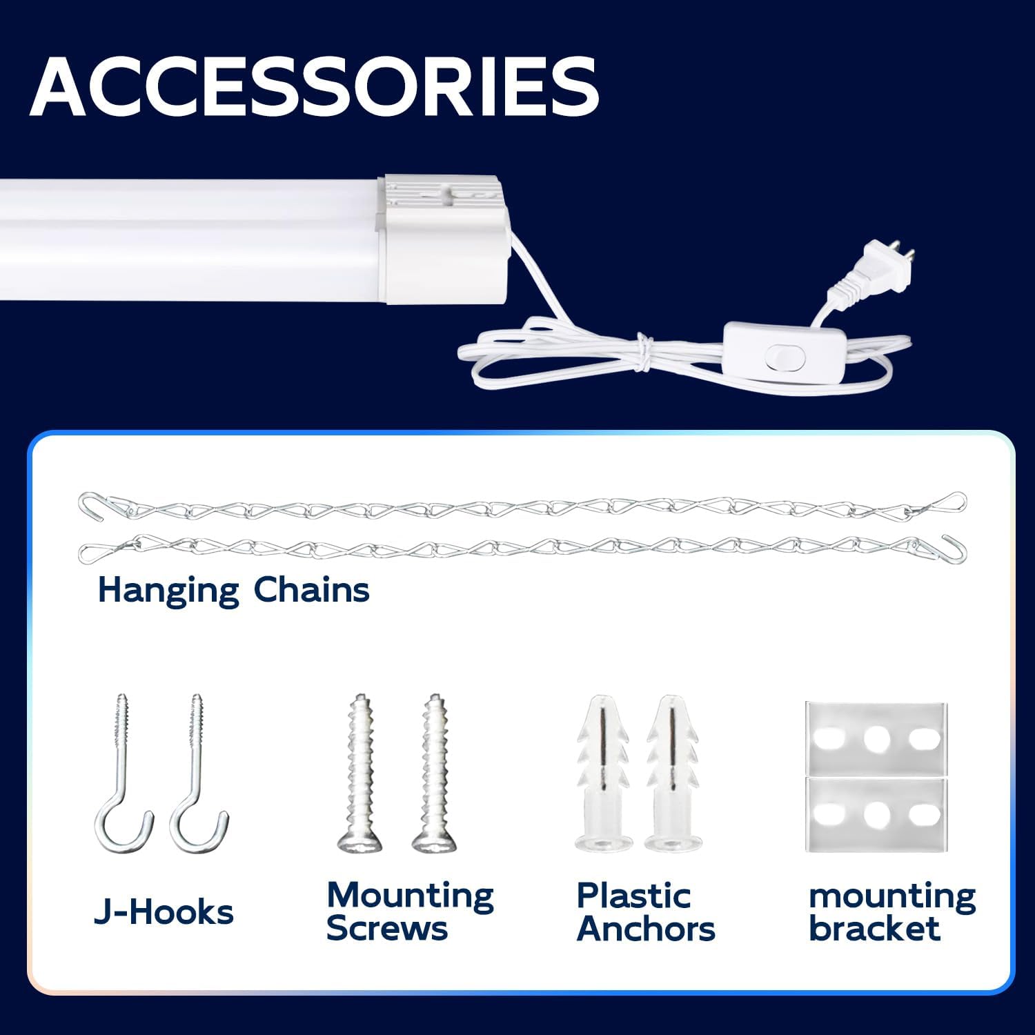 - ā Easy Installation - Plug & Play. Come with 59" power cord with on/off switch and other small accessories. You can hanging it with the included hanging chains or directly mounted to the ceiling with the included mounting screws