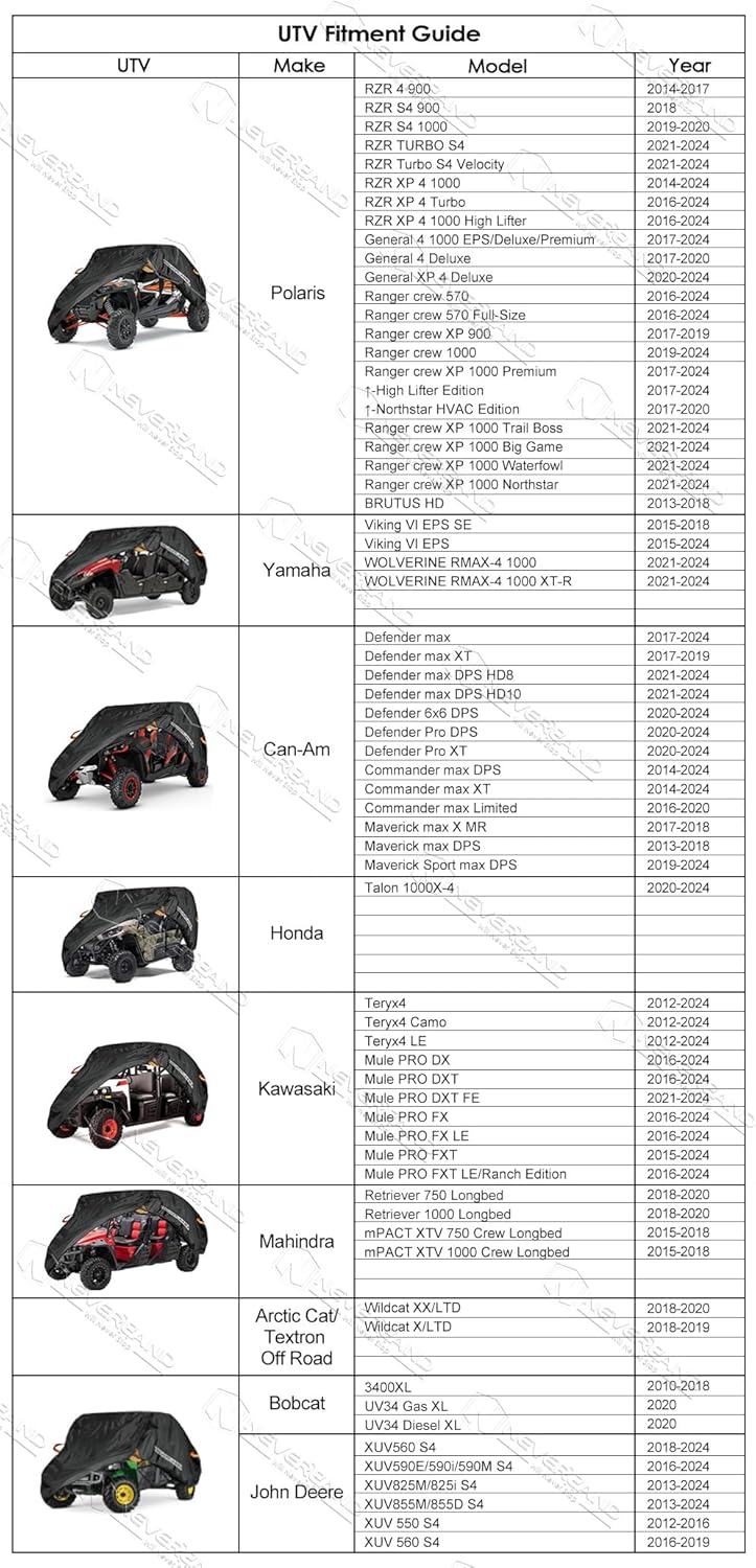 - [Fits Most 4-6 Seats]: You can refer to the compatibility table given on the chart, our covers are compatible with polaris, rzr, yamaha, can-Am defender, kawasaki mule ranger etc. Up to 157" in length, please check UTV sizes carefully before purchasing
