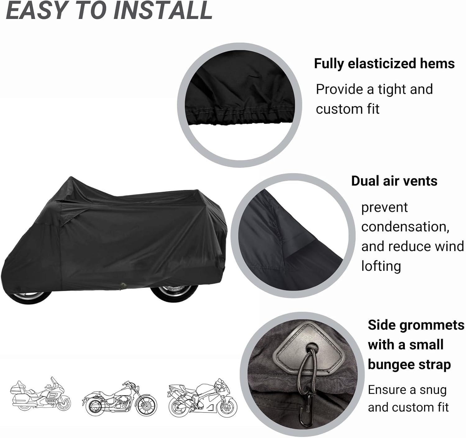 - Secure Fit: Fully elasticized hems, side grommets with a small bungee strap ensures a snug, custom fit; Your vehicle remains protected even in strong winds