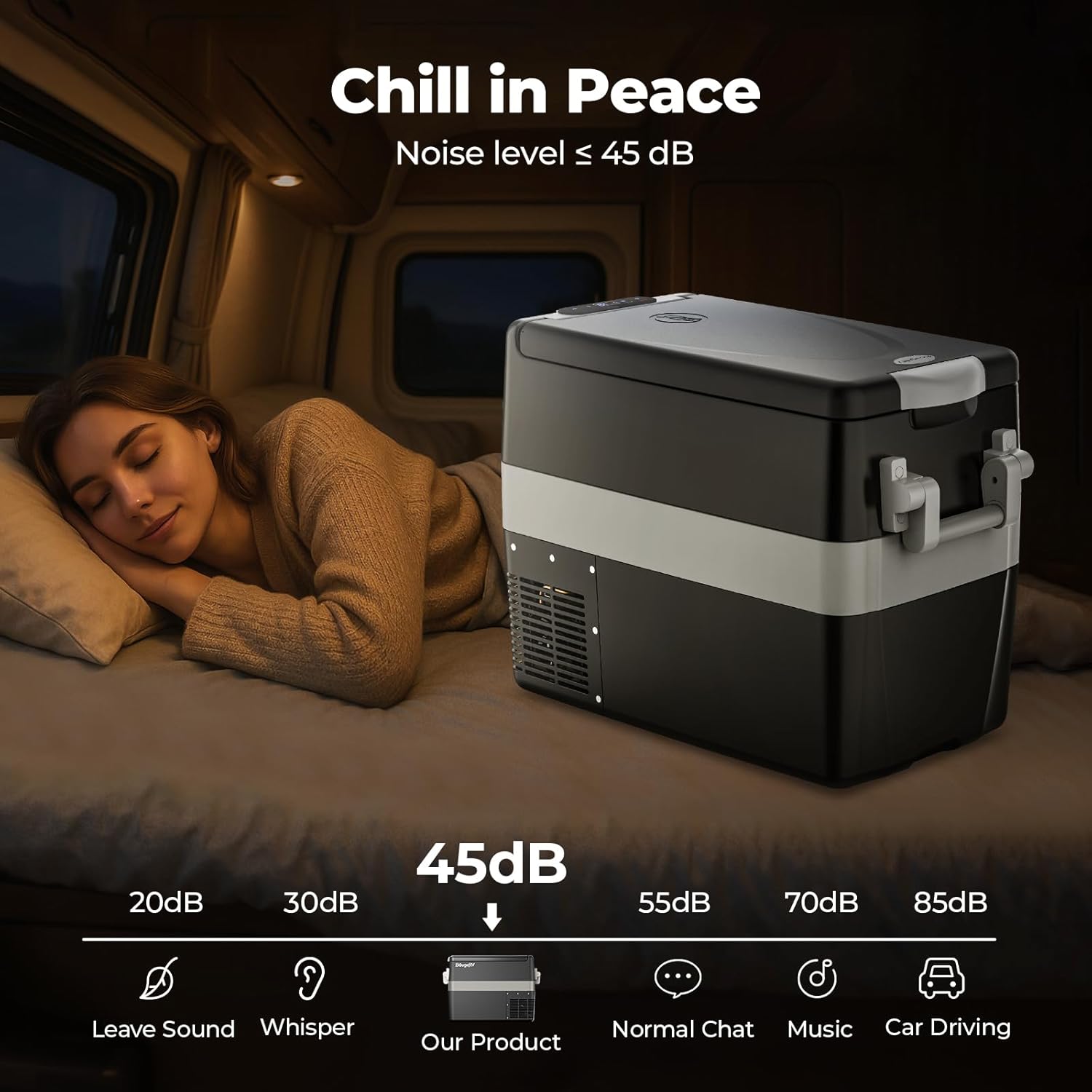 - 45dB Low Noise & Battery Protection: The truck freezer is designed to lower noise to make sure you have a good sleep after long driving. The RV fridge/freezer is equipped with a 3-level battery monitor to prevent itself from draining your vehicle's battery