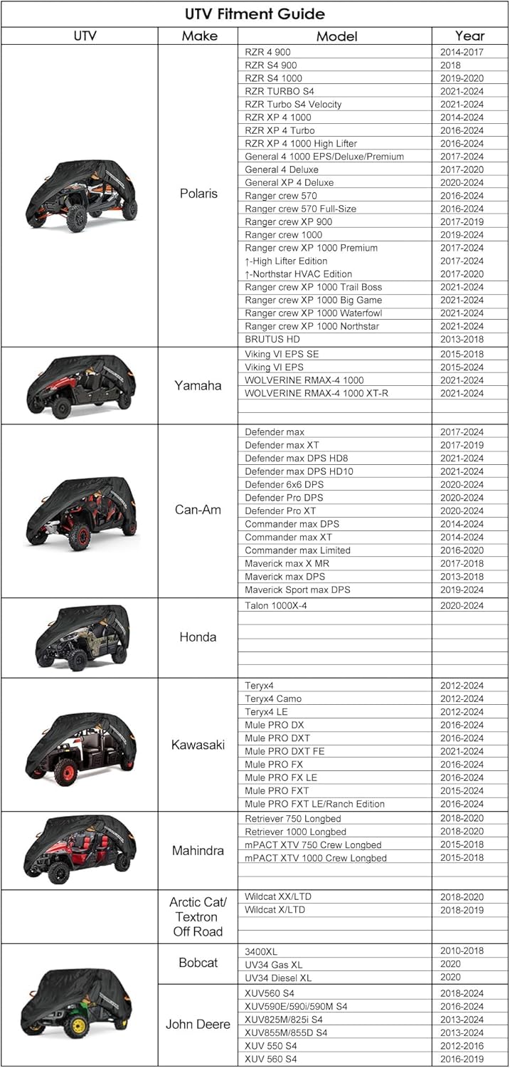 - Sturdy & High Performance Cover: Made with Denier Oxford Cloth and double-stitched seams for year-round use; Our unique Heavy duty& Water repellent treated fabrics covers is protects against rain, wind, snow, sun, bird poop, tree sap and dirt and won't crack in cold weather, protect UTV from sun,rain,water damage. NOTE: Not recommended for trailering