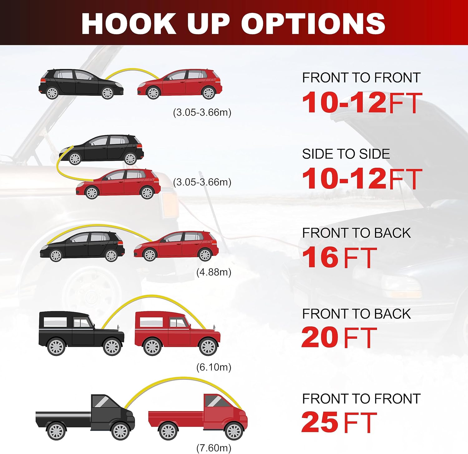 - Premium Performance - 6 Gauge 20 Feet Automotive battery jumper cables for jump starting a dead or weak battery. High density copper clad aluminium make it has excellent conductivity. Perfect for most motorcycles, cars, SUVs.