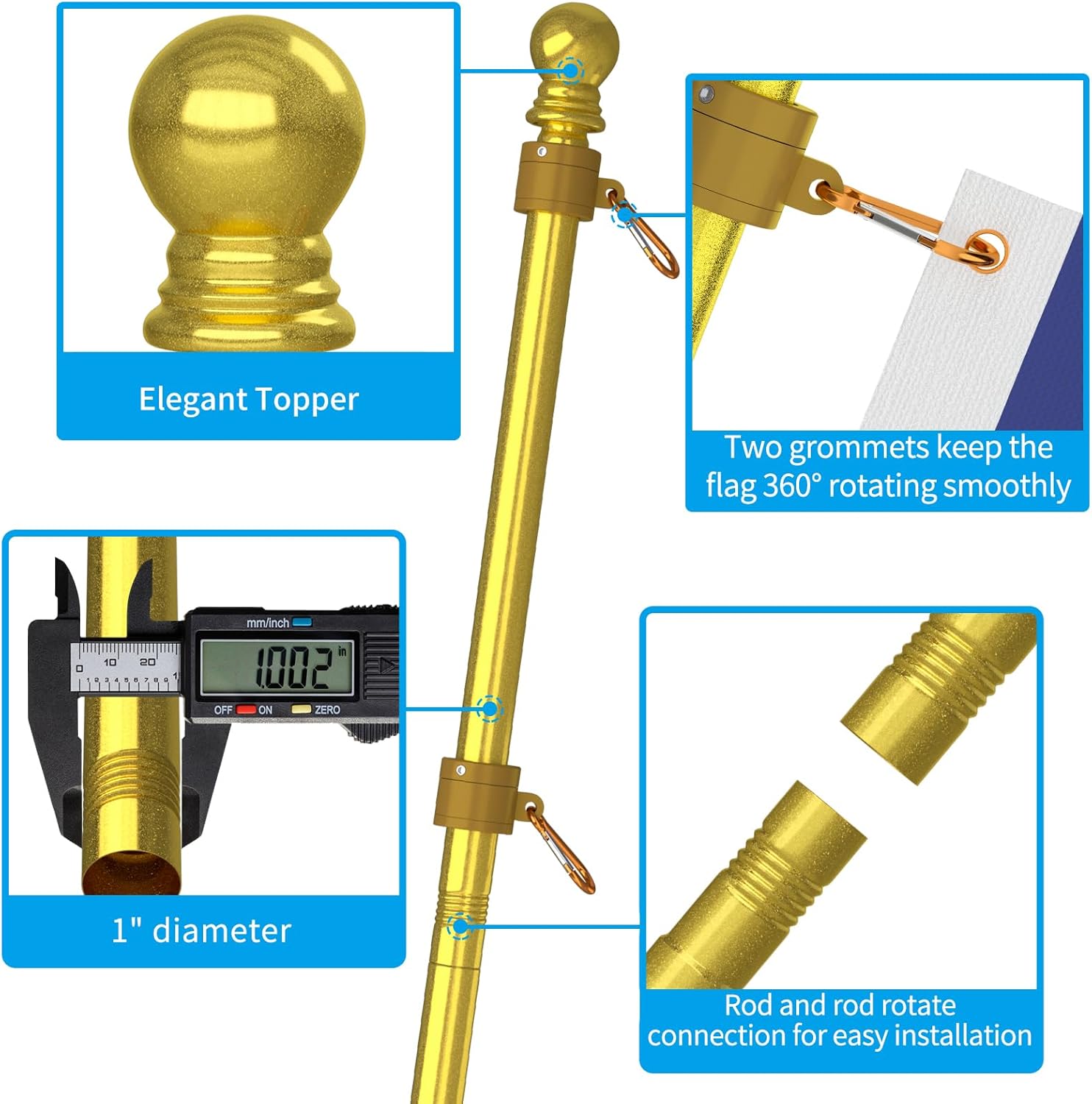 - 🇺🇲Exquisite Design: 1*Flag Pole Diameter 1'', 1*Upgraded Bracket, 2*Tangle Free Rings, 4*Carabiners, 1*Top Ball, 1*Installation Manual.