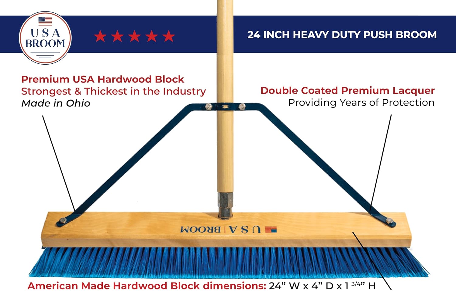 24" Everyday Sweep Indoor/Outdoor Push Broom with 60" Handle. Ideal for Garages & Shops. Durable American Made Steel Brackets-All Stainless Steel Hardware. No Plastic. 100% Made in The USA.
