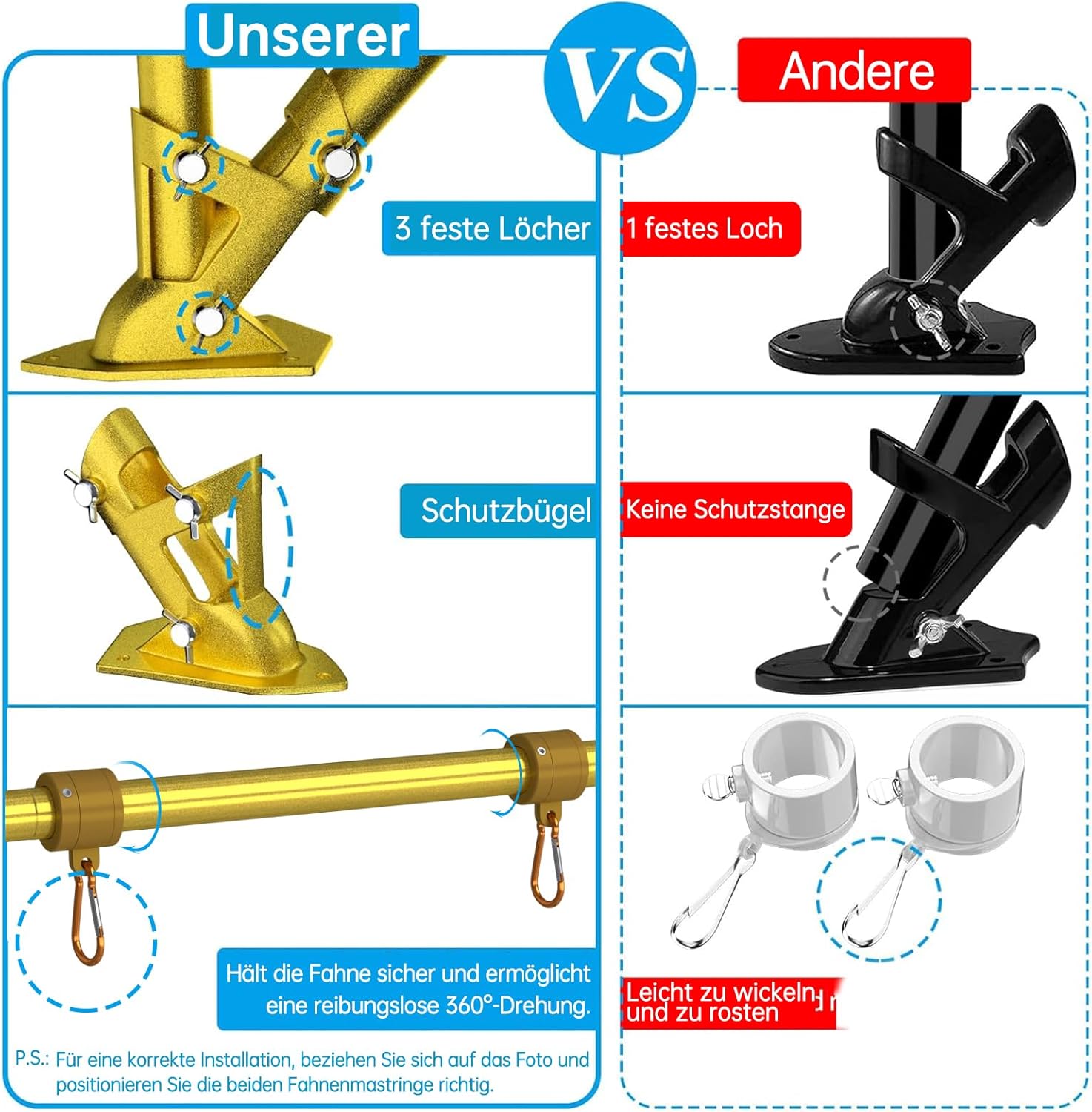 - Unique Bracket: The high strength aluminum alloy flag pole holder for outside house has been upgraded with unique protective bar and 3 fixed holes to make the two-position (90° and 45°) flagpole more stable