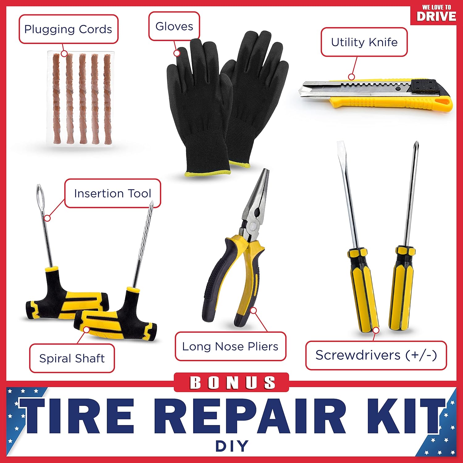 - Complete Tire Repair Kit Be ready for the unexpected with this Tire Repair Kit with Air Compressor, featuring a 12V Air Compressor, Tire Patch Kit, Tire Plug Kit, and Tire Plug Kit Heavy Duty Professional for fast and effective fixes. Perfect for urban commutes or off-road trips, it includes tools for sealing punctures, inflating tires, and more. This Car Interior Accessories is a must-have Roadside Emergency Kit, ideal for travel or Car Camping, keeping you prepared for every journey.