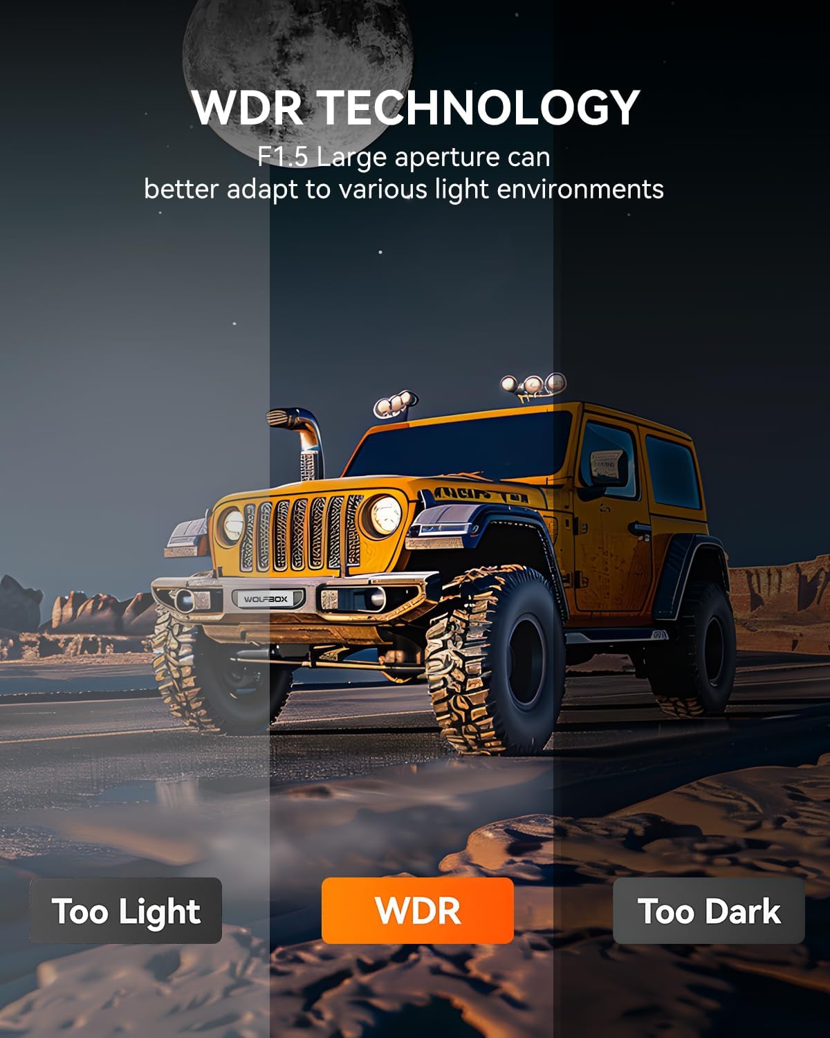 - Unique WDR+F1.5 Large Aperture - Customers who use other rearview mirrors" hope that the rear camera has better clarity and night vision". WOLFBOX has specially developed a 2.5K UHD rear camera equipped with WDR technology. Thanks to the excellent F1.5 large aperture, it can better adapt to various light environments and realize the starlight night vision effect of front and rear dual perspectives. Get crystal-clear picture quality, whether day and night or through tunnels.