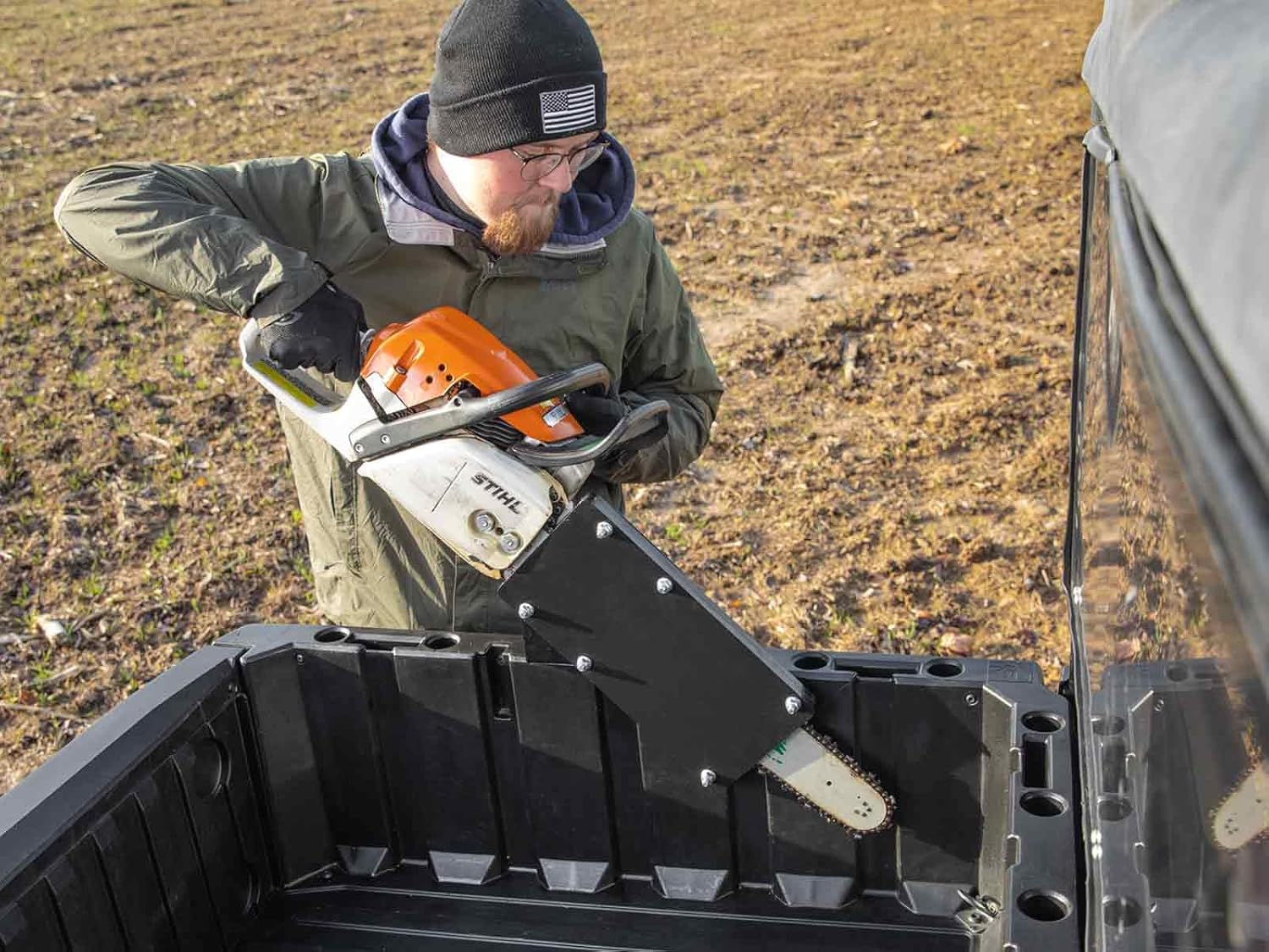 - Features: This Polaris Ranger chainsaw mount is made from durable, powder-coated UHMW. It can be installed either inside or outside of your bed, which gives you more control over your cargo space and accommodates all chainsaws up to 20”.
