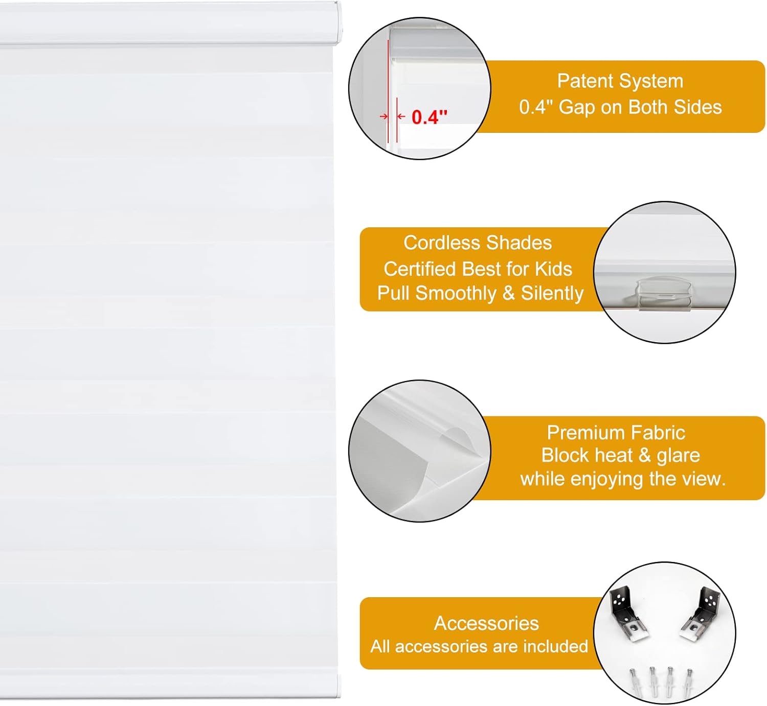 Persilux Zebra Blinds for Windows, Dual Layer Zebra Roller Shades (45" W x 72" H, White) Light Filtering Sheer Shades, Easy to Install, Cordless Room Darkening Roller Blinds for Office