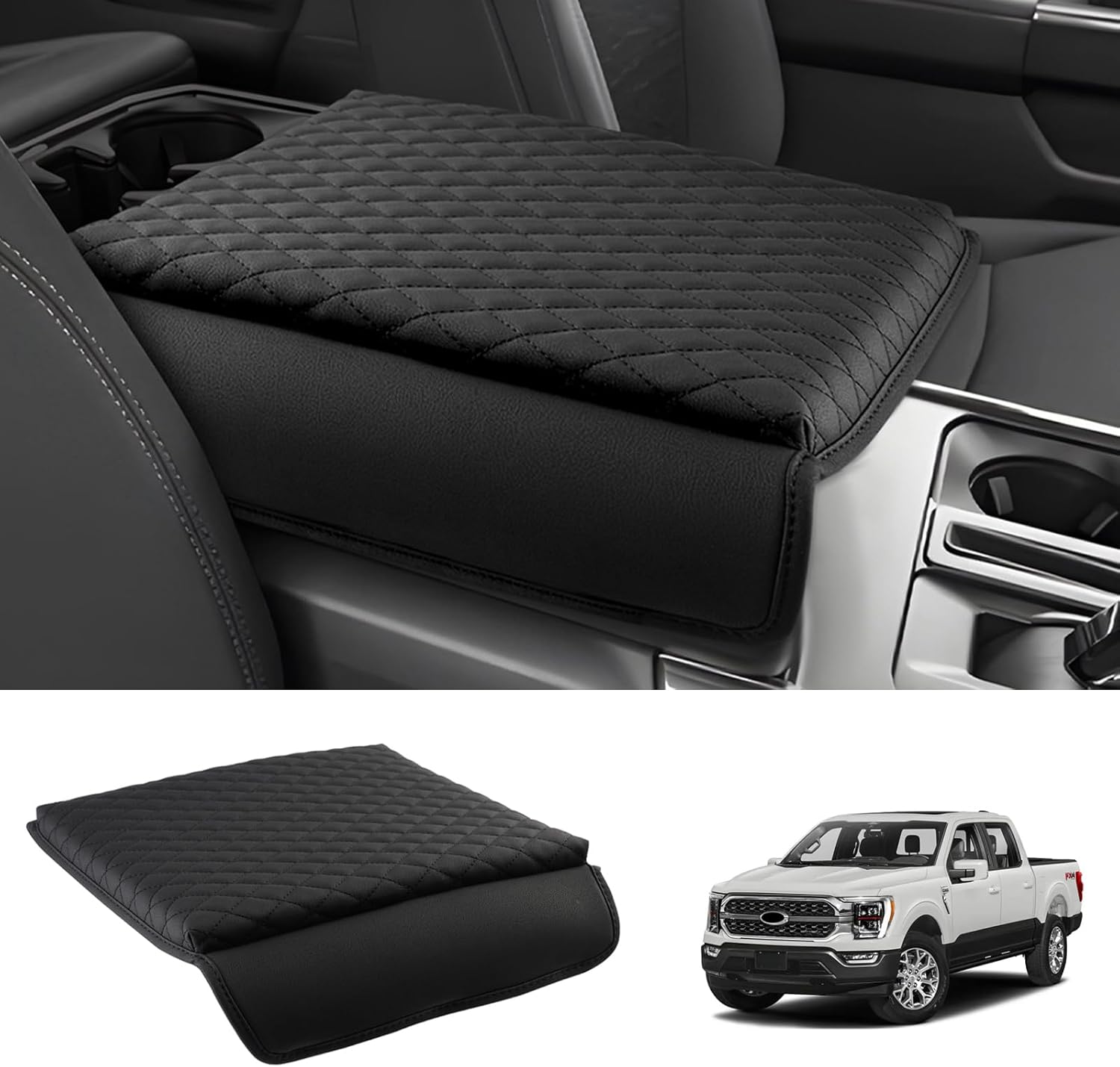 - Great Protection for Console: A must-have console cushion for Ford F150 armrest.The center console cover gives full protection to your car armrest box from spills, scuffs, dirt, pet claws and sticky fingers.This center console cover can protect the tops and sides of the console and hide the ugly tear in the leather.