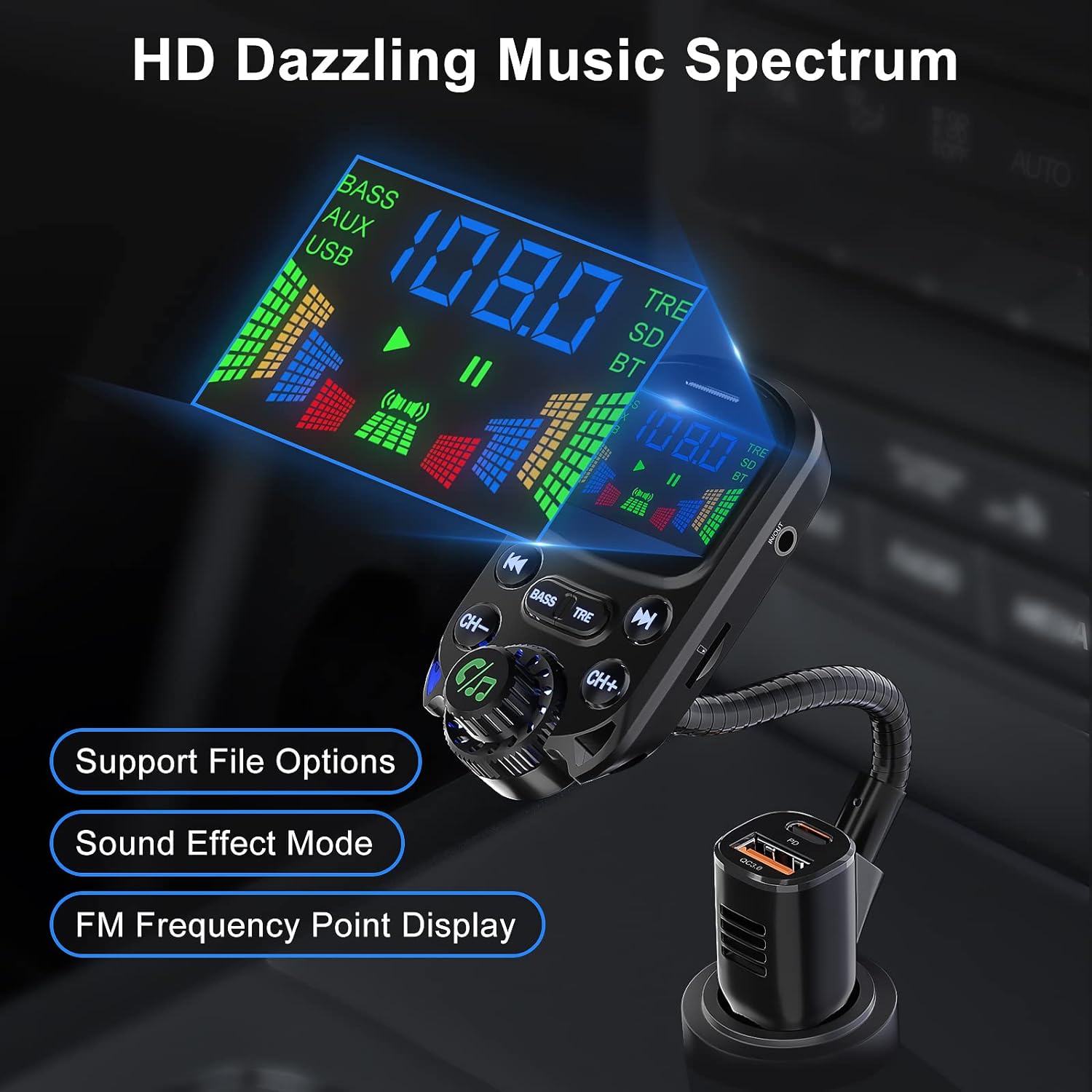 - [1.6” Color Screen/Flexible Gooseneck] - 1.6" LED screen is large and clear enough for you to easily read at daytime or night for incoming calling, song name (Under TF/U-disk Modes), voltage, volume, etc. The rotatable gooseneck of the wireless radio adapter can provide you with an adjustable viewing angle and optimal viewing comfort of LED display screen.