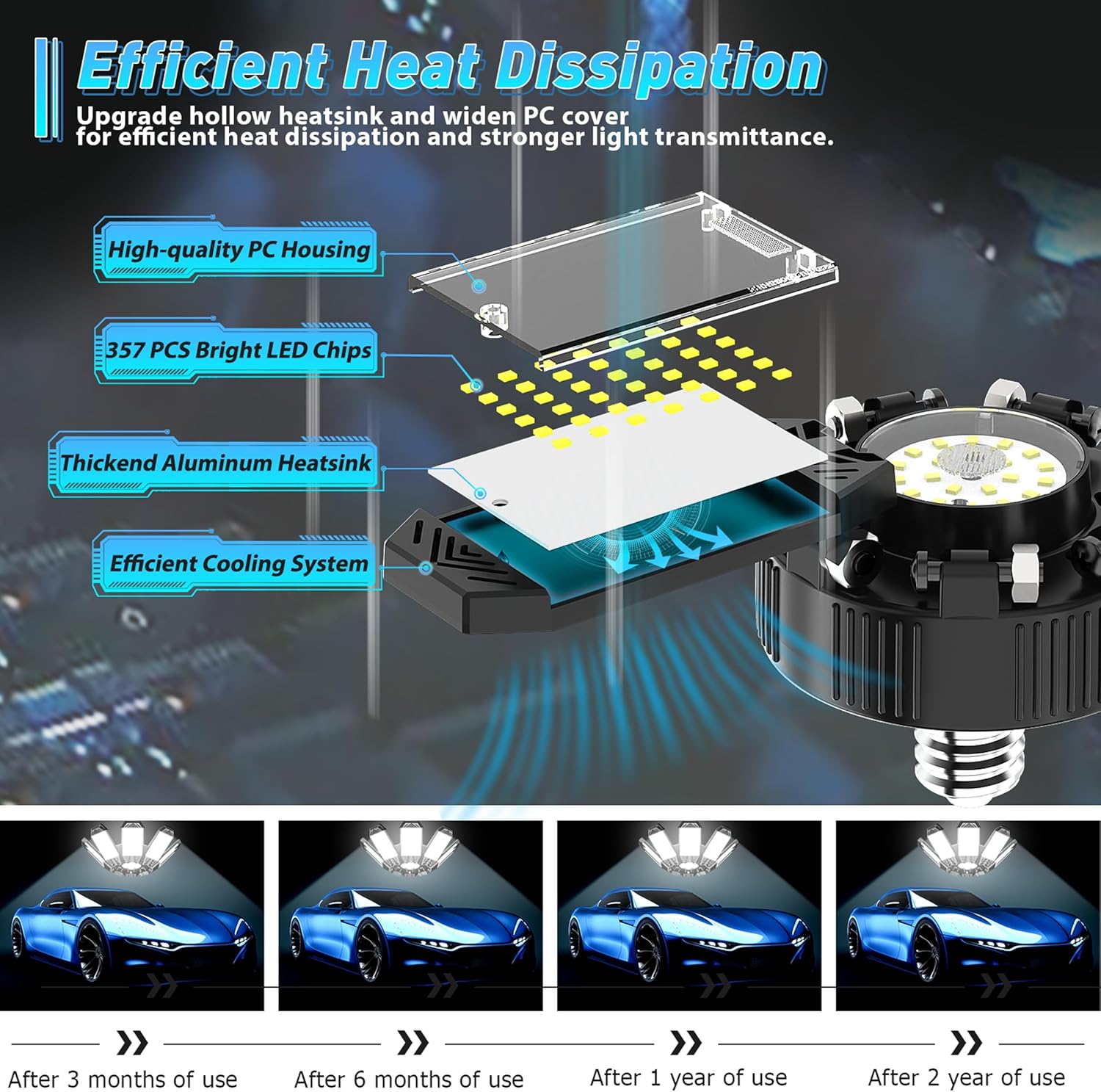 - Efficient Heat Dissipation: Constructed with ABS panels, aluminum heatsink and hollow structure, improves heat dissipation efficiency, making the garage light resistant to high temperatures, ensures stable performance and extends the lifespan of the garage led light bulb to over 50,000 hours. No more frequent bulb replacements or unexpected failures.