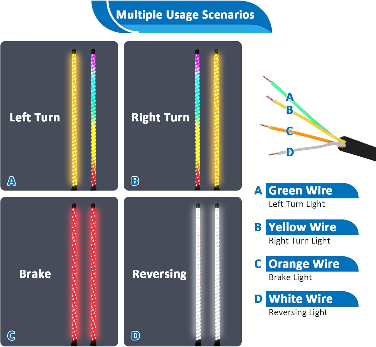 - [Installation & Package] - Easy to use, our RGB LED Whip Light is a plug-and-play design with a quick-release base, no modification is required. Package Includes 2 x 4FT LED Whips,2 x Spring Bases,2 x American Flags(with flag hooks),2 x Dust Caps,2 x extension wiring harnesses,1 x Controller,1 x Control Box,1 x Installation Instructions. With a cell phone or a control box, you can control both the whip lights, rock lights or RGB led light bars at the same time and realize the same frequency