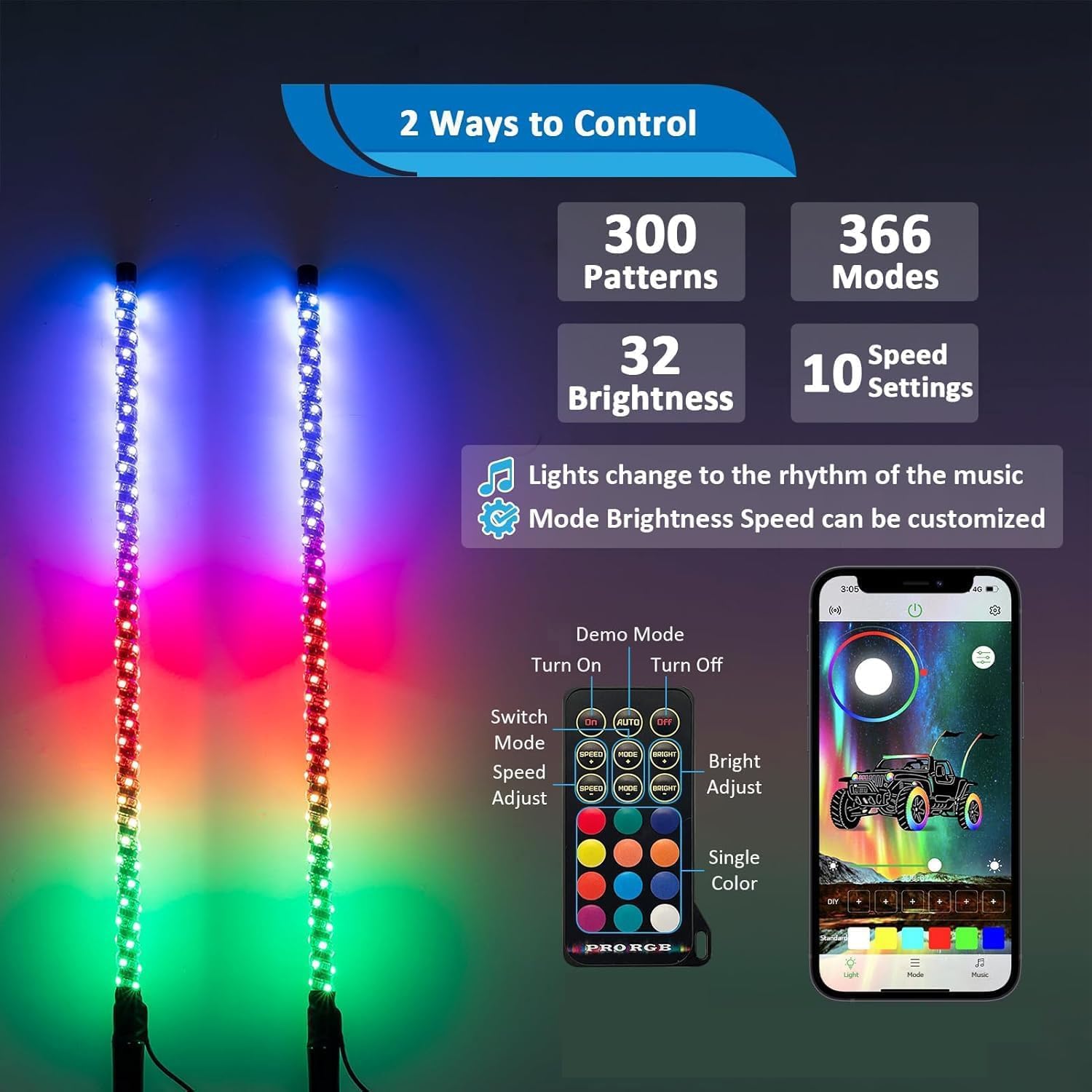 - [User-Friendly Operation] - This 4FT RGB LED Whip Light can be operated via controller which is more convenient and user-friendly. Through it allows you to operate at a range of 50ft easily, The controller meets the inconvenience of your cell phone.