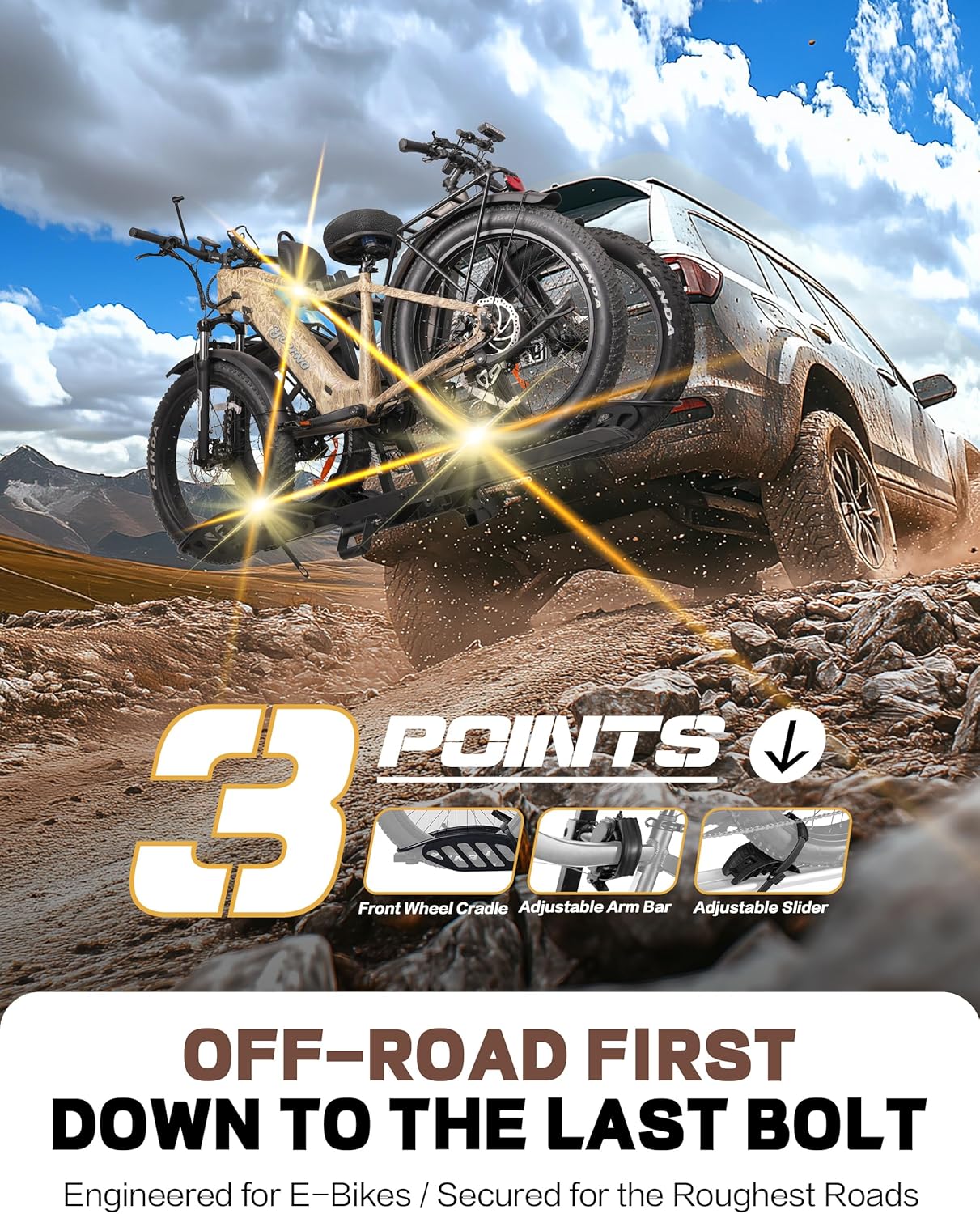 - PATENTED ANTI-WOBBLE & ENHANCED GRIP: Our 2-inch tow-mounted electric bike rack has a patented V-shape cradle and bolt system for secure transport. Shock-absorbing hitch threads ensure stability, while upgraded semi-enclosed connection blocks on support bars provide a stronger grip on e-bikes.