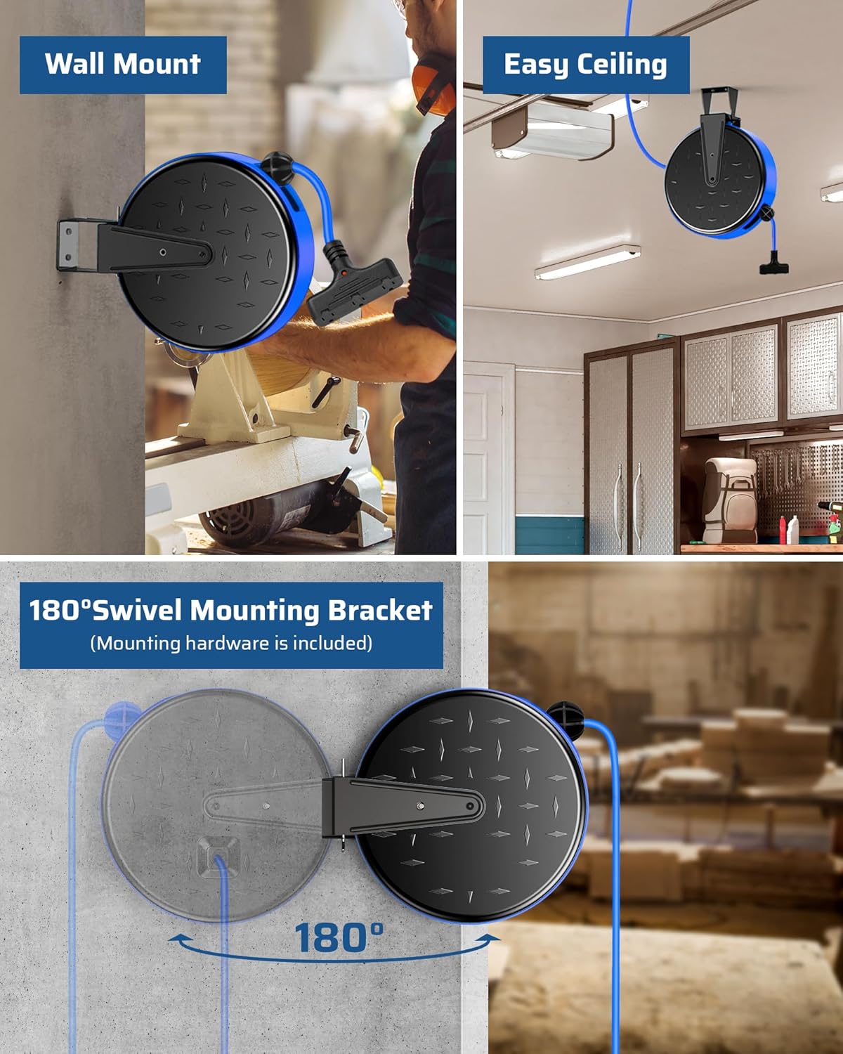 - [Ceiling/Wall Mount with 180° Swivel Bracket] The swivel mounting bracket lets the extension cord reel swivel freely up to 180 degrees; perfect for hanging from your garage ceiling or mounting to a wall; easy to pull and release cord, freeing up more workspace and make storage a breeze; avoid tangled cords or people tripping up