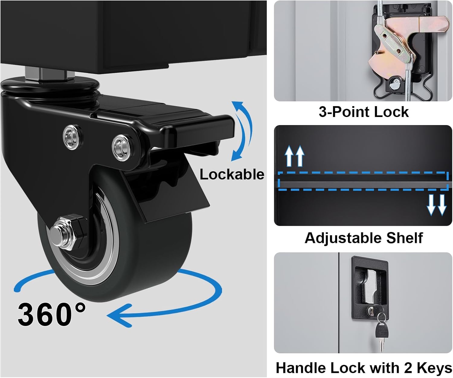 - 🛞【Mobile & Lockable Wheels】This rolling metal storage cabinet with wheels comes with four swivel wheels, allowing you to easily move it to your desired location. Additionally, the wheels can be locked to keep the cabinet fixed in place.