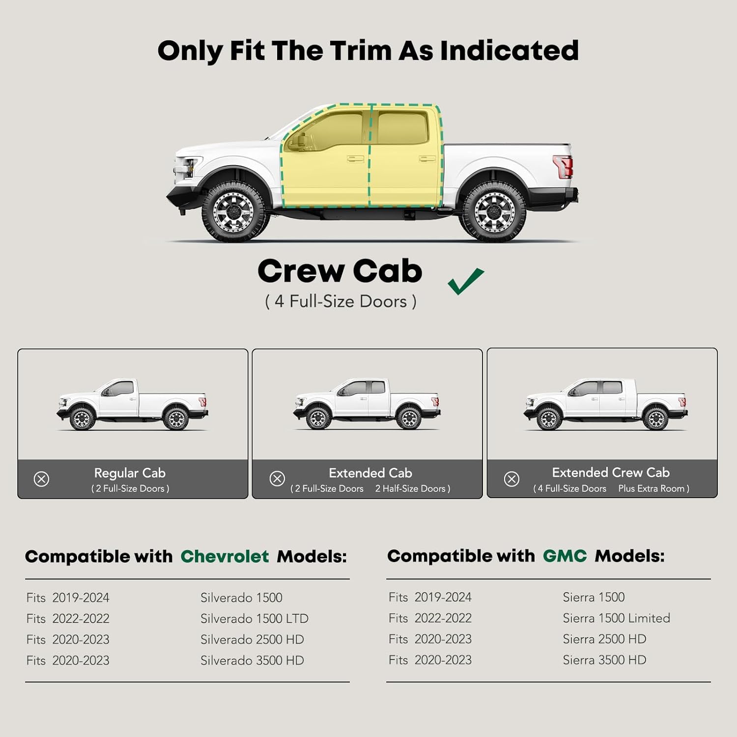 - Confident Fitment: Cab length side steps fit the Chevrolet and GMC Models: Silverado/Sierra 1500 19-24, Silverado 1500 LTD/Sierra 1500 Limited 22, Silverado/Sierra 2500 HD & 3500 HD 20-24, Crew Cab(4 Full-Size Doors), Not fit Body Lift Kit or Diesel models with DEF tanks