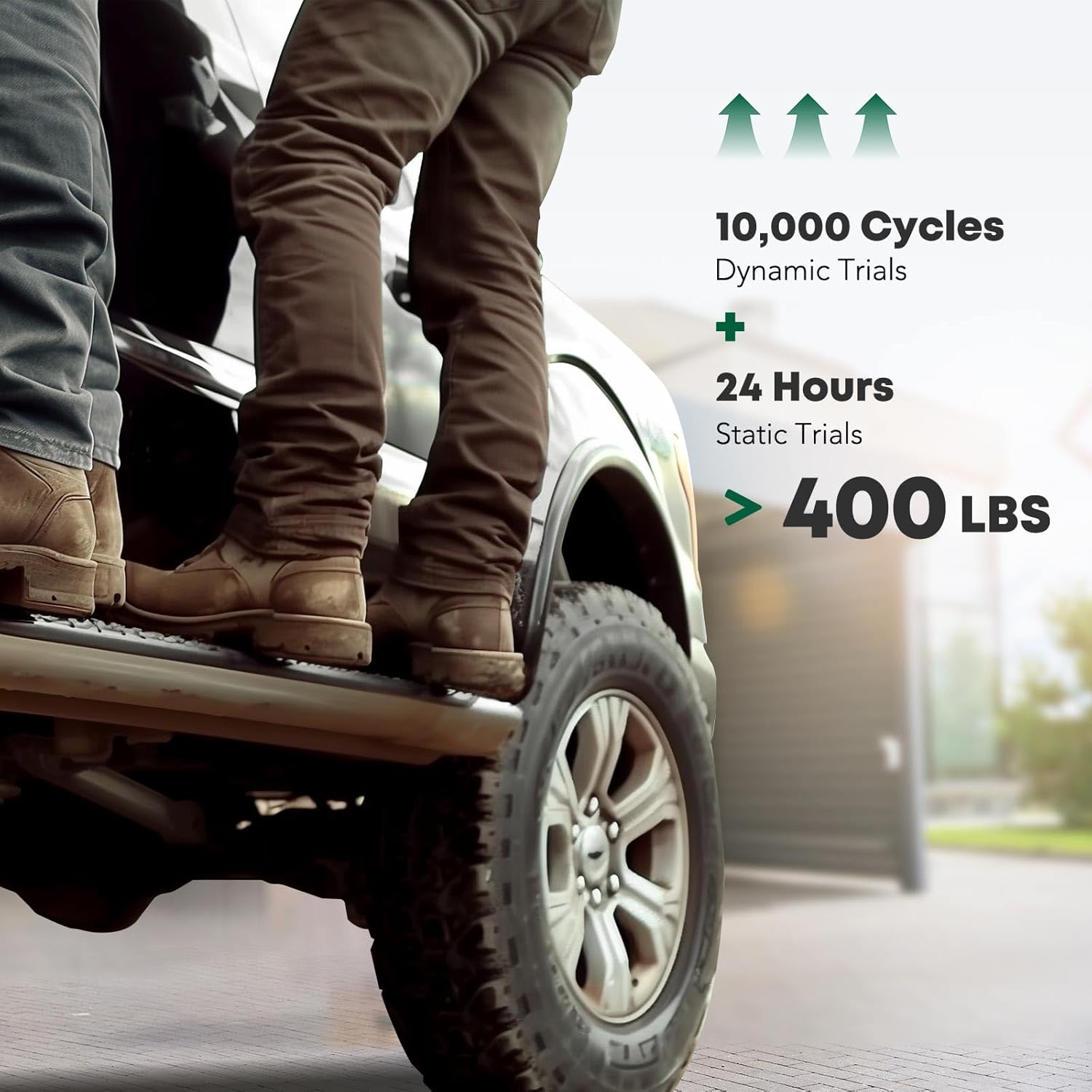 - High-Strength Steel: The step bars are crafted from high-strength Q235A steel and are enhanced with an electrophoretic layer and powder coating. This dual-layer protection greatly improves wear and corrosion resistance, while also imparting a sophisticated appeal