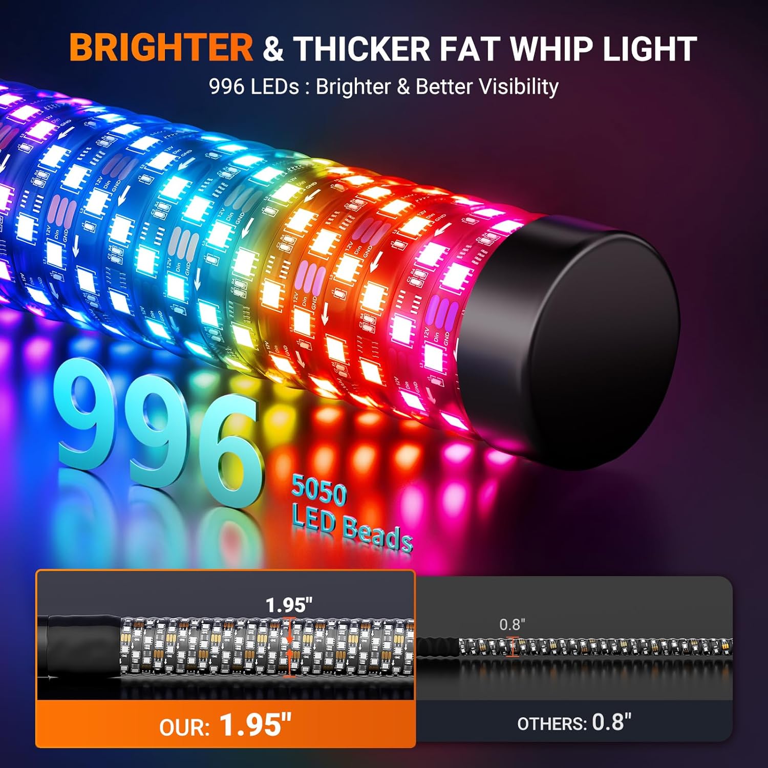 - ăUPGRADED 1.95 IN DIA and BrighterăEhaho 3FT Fat Whip Lights pack 996 RGB LEDs using the latest 5050 RGB LED chips. These LED Fat Whip Lights are three times brighter and more visible, even in daylight. Featuring a smaller gap and the tightest coiled spiral design, these Fat LED Whips glow in a 360° direction, delivering brighter and more uniform colors