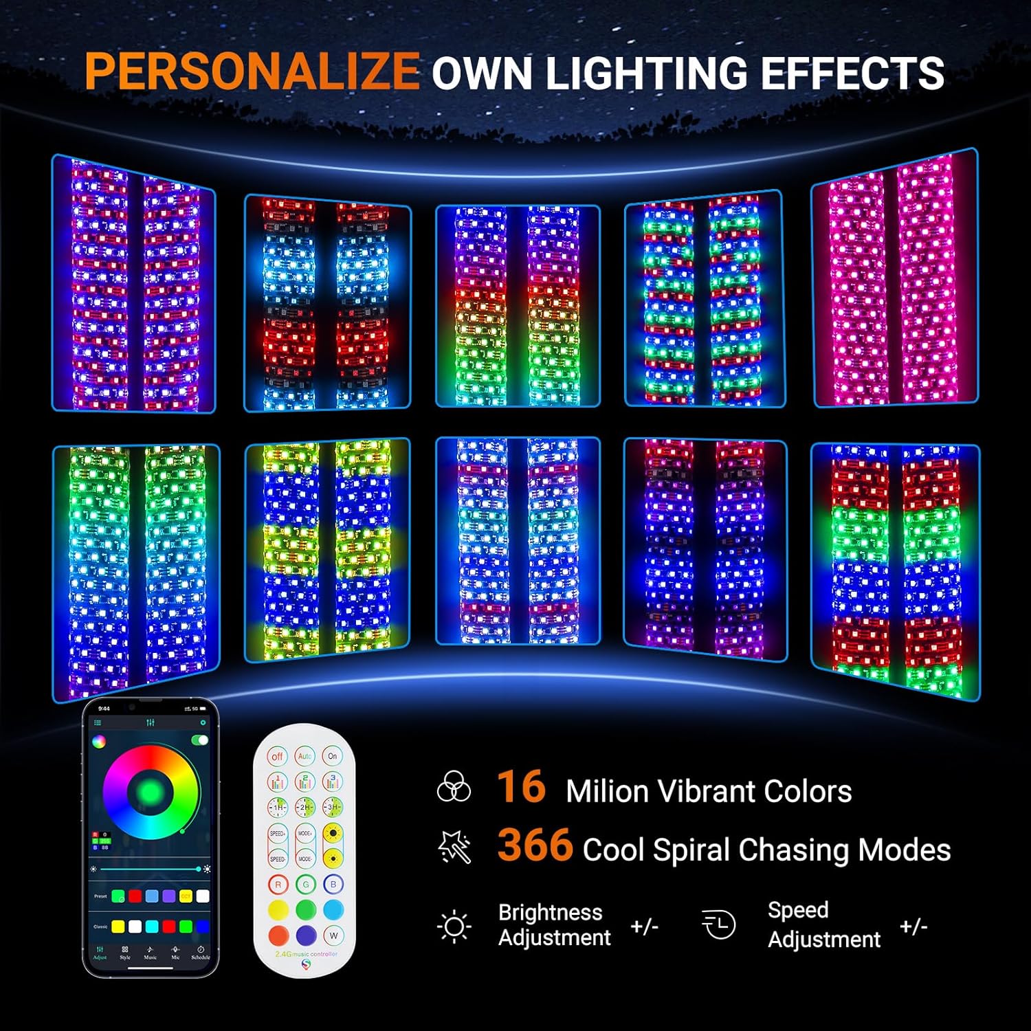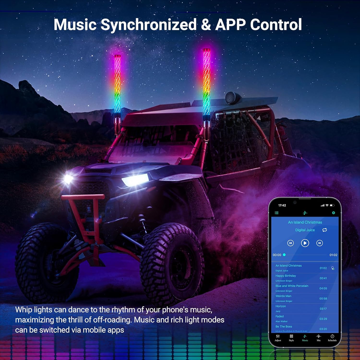 - ăDual Control and PersonalizeăFeaturing countless built-in colors and 366 customizable patterns, these whip lights can stream, strobe, cascade, chase, pulse, and more. They are controllable via an app or remote control, allowing users to personalize the light modes, adjust brightness, and set the movement speed to enrich your off-road trip