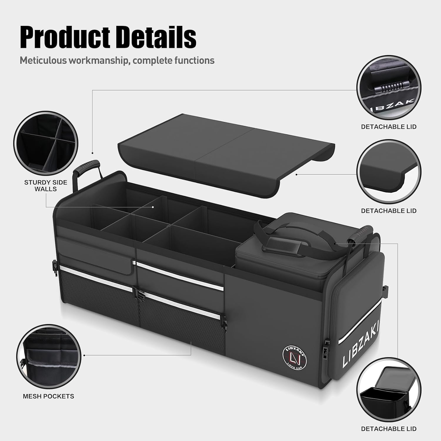 LIBZAKI Oversize 4 in 1 Car Trunk Storage Organizer, Multi Compartment Collapsible Trunk Storage Box with Cooler Bag for Car Truck SUV-Black