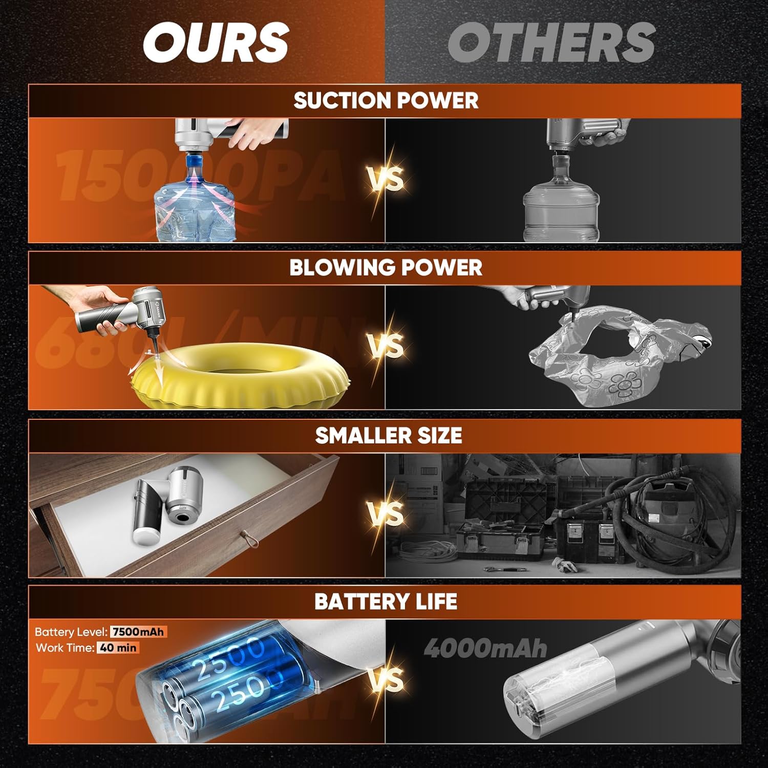 - ăPractical accessoriesăThe included extension tube can easily clean hard-to-reach corners, and the sleeve with a brush can easily remove stubborn dust in the gaps. With the blowing accessory set, you can quickly inflate the swimming ring and kayak, and you can also help with combustion in outdoor barbecues, help carpenters blow away sawdust, and vacuum storage bags. Rich accessories can make your life more convenient.This set is also suitable as a Father's Day gift.
