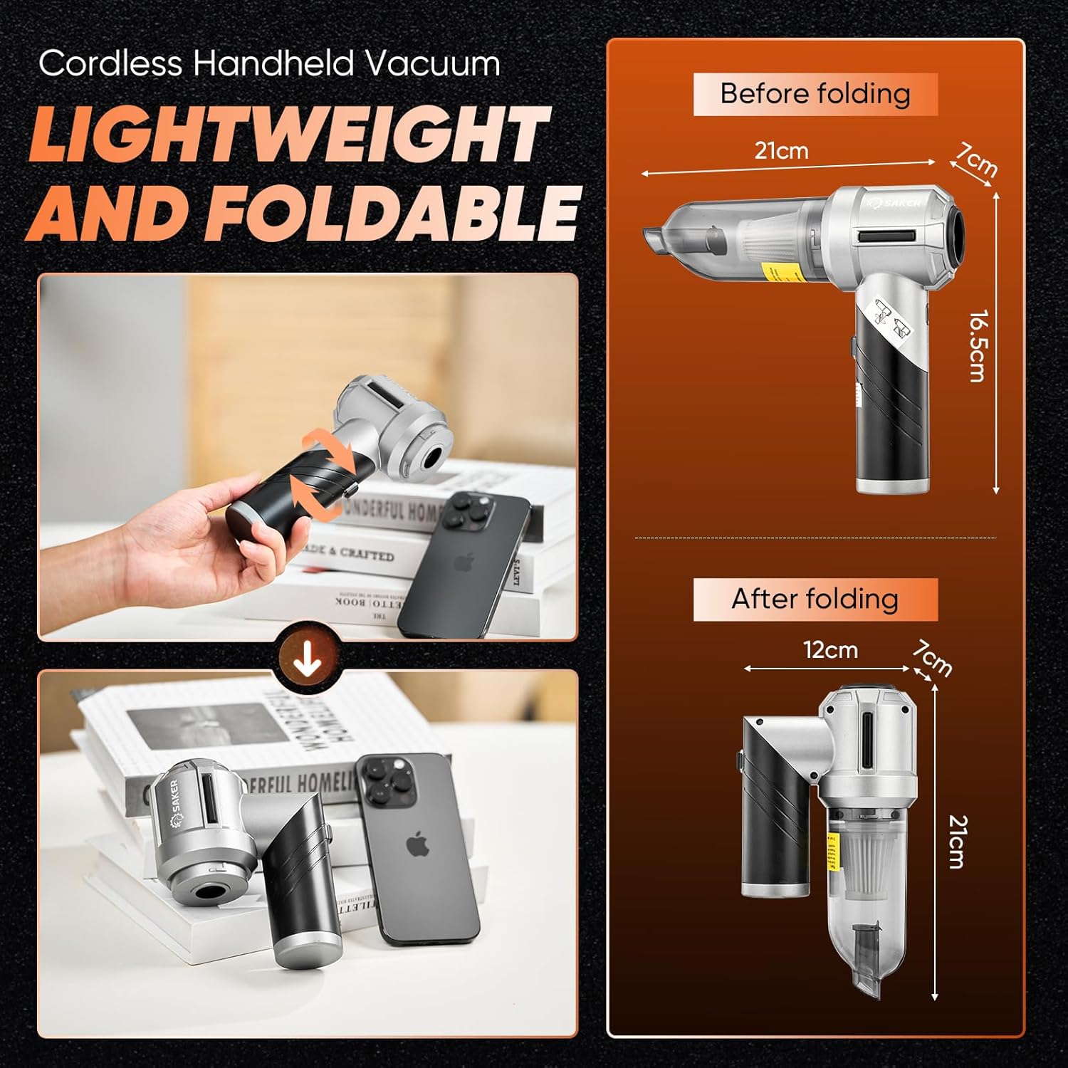 - ăLightweight and PortableăSaker fold-able vacuum cleaner is compact, only 380g, wireless use is not limited by space, and it can be rotated and folded. After folding, it is only as big as the palm, which can be more convenient to carry and store.