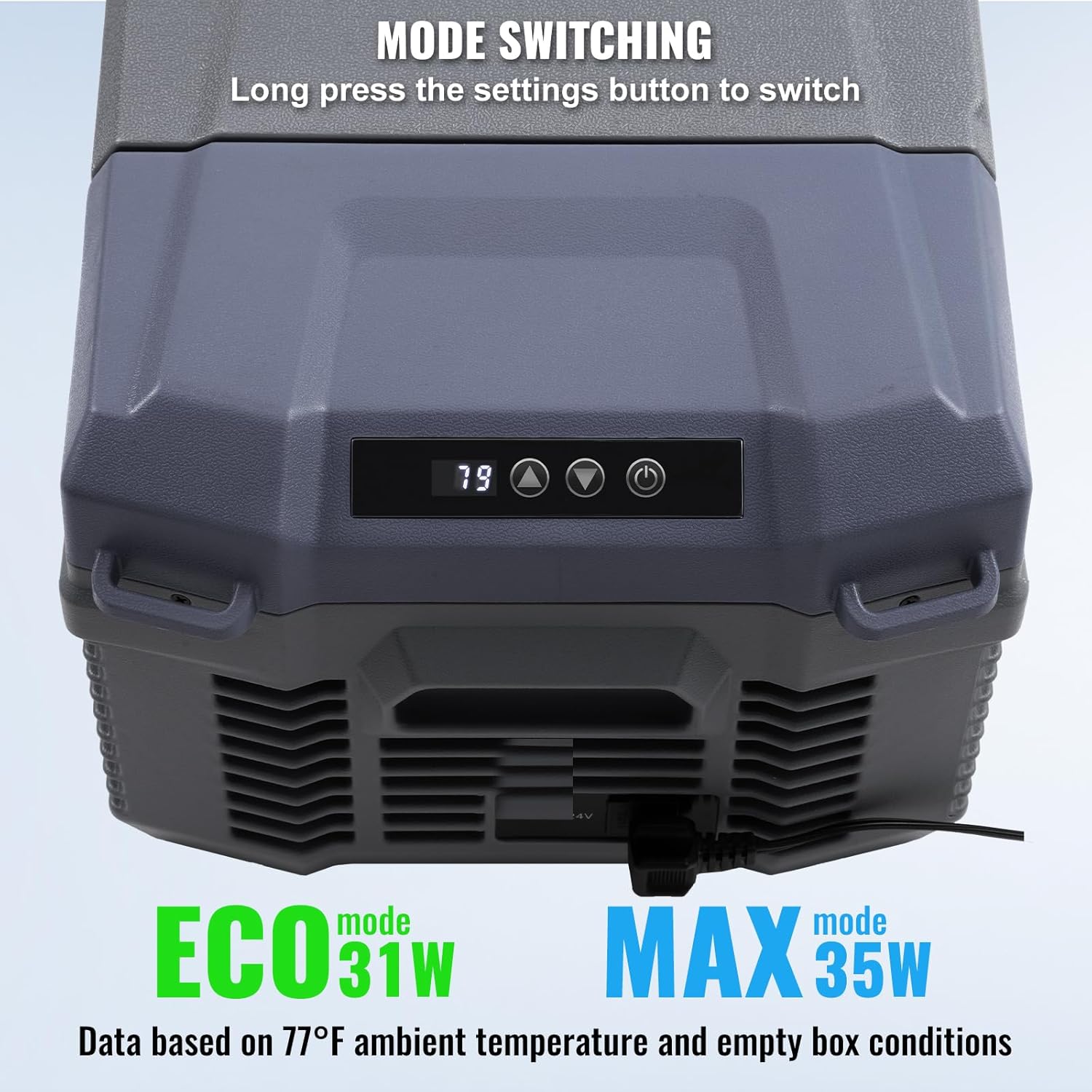 - Quiet & Energy Efficient: The fridge operates with noise ≤ 45dB, ensuring you sleep well after long drives. You can also choose between ECO and Max modes via the LCD touchscreen. In ECO energy-saving mode, the operating power of this portable fridge is less than 31W. Even when running in MAX mode (35W), its intelligent circulation consumes less than 1 kWh/day.