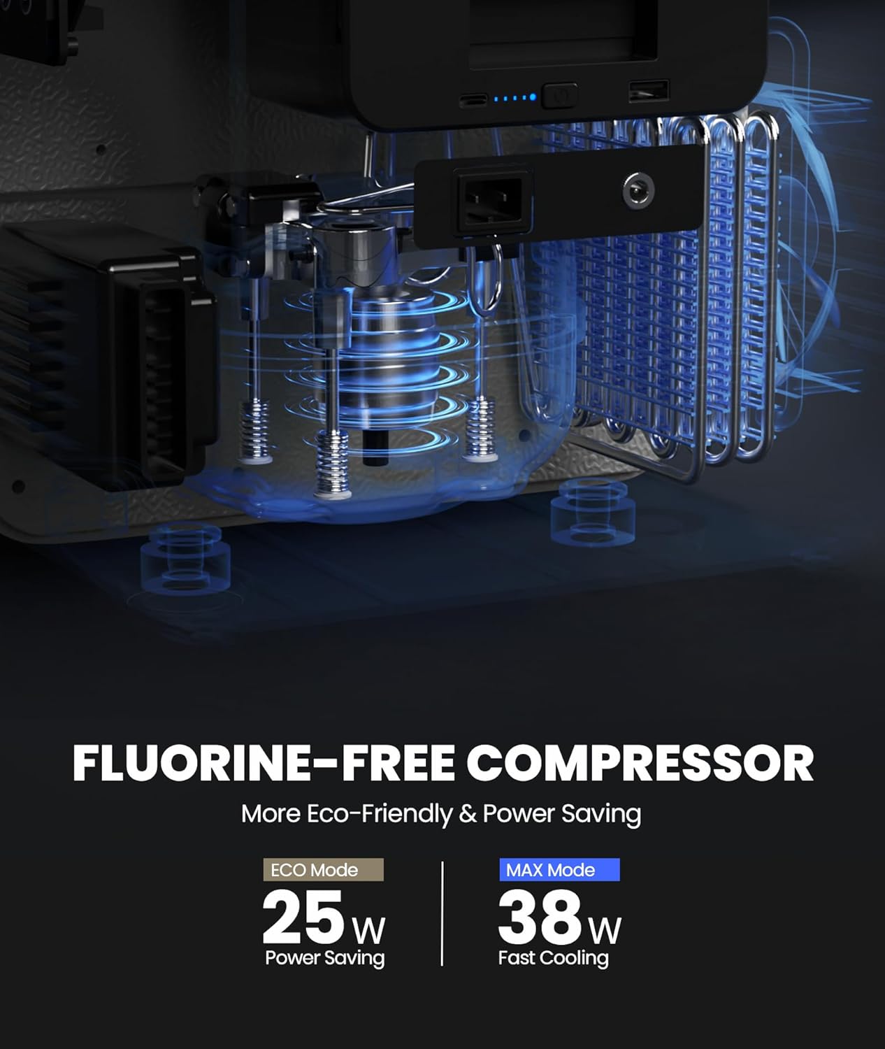 - 38 W Low Power Consumption: Cooling mode can be selected between MAX mode with 38 W power for fast cooling or ECO mode with 25 W power for power saving. Even running in MAX mode, it consumes less than 0.5 kwh/day. With a battery and a solar panel, we can keep it running all the time without having to pay for electricity