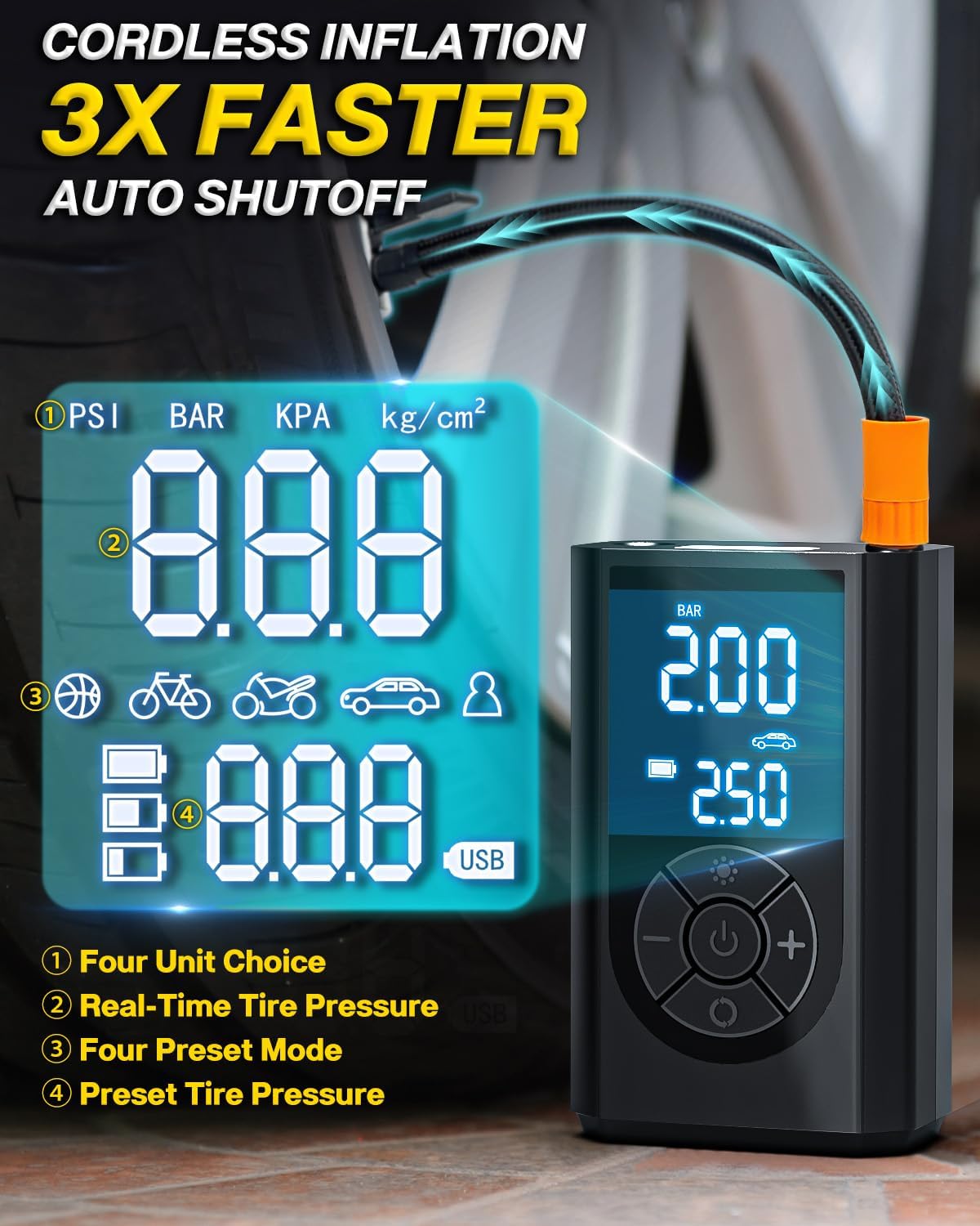 - Smart Digital Display: The integrated digital pressure gauge provides real-time tire pressure readings, ensuring precise inflation. Easily set and monitor the desired pressure to prevent over- or under-inflation.