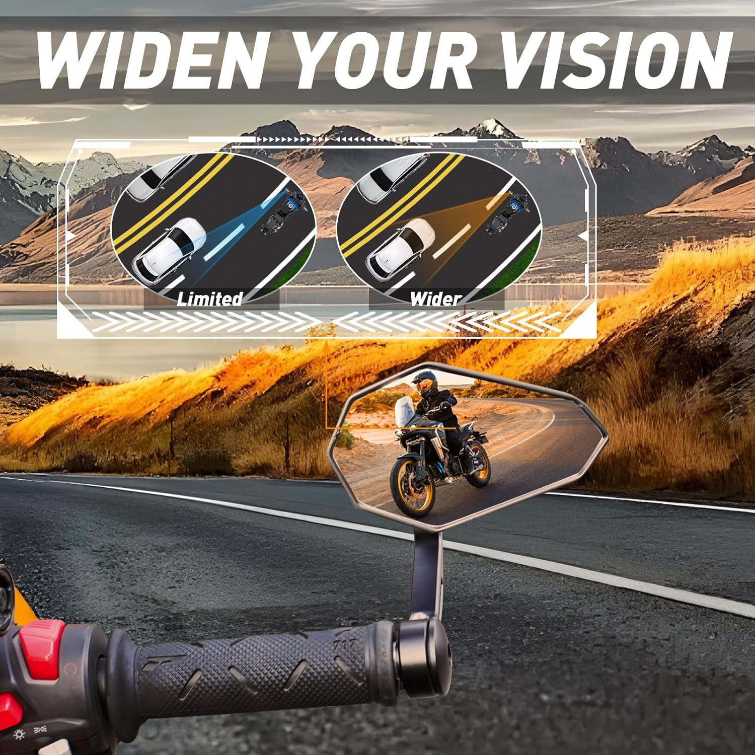 - Clear & Wide Rearview Vision – Our Motorcycle Handlebar Bar End Mirror features a high-definition convex glass lens, providing a wider field of view to reduce blind spots and improve safety. The anti-glare coating enhances visibility in various lighting conditions, ensuring a clear and distortion-free rearview while riding.