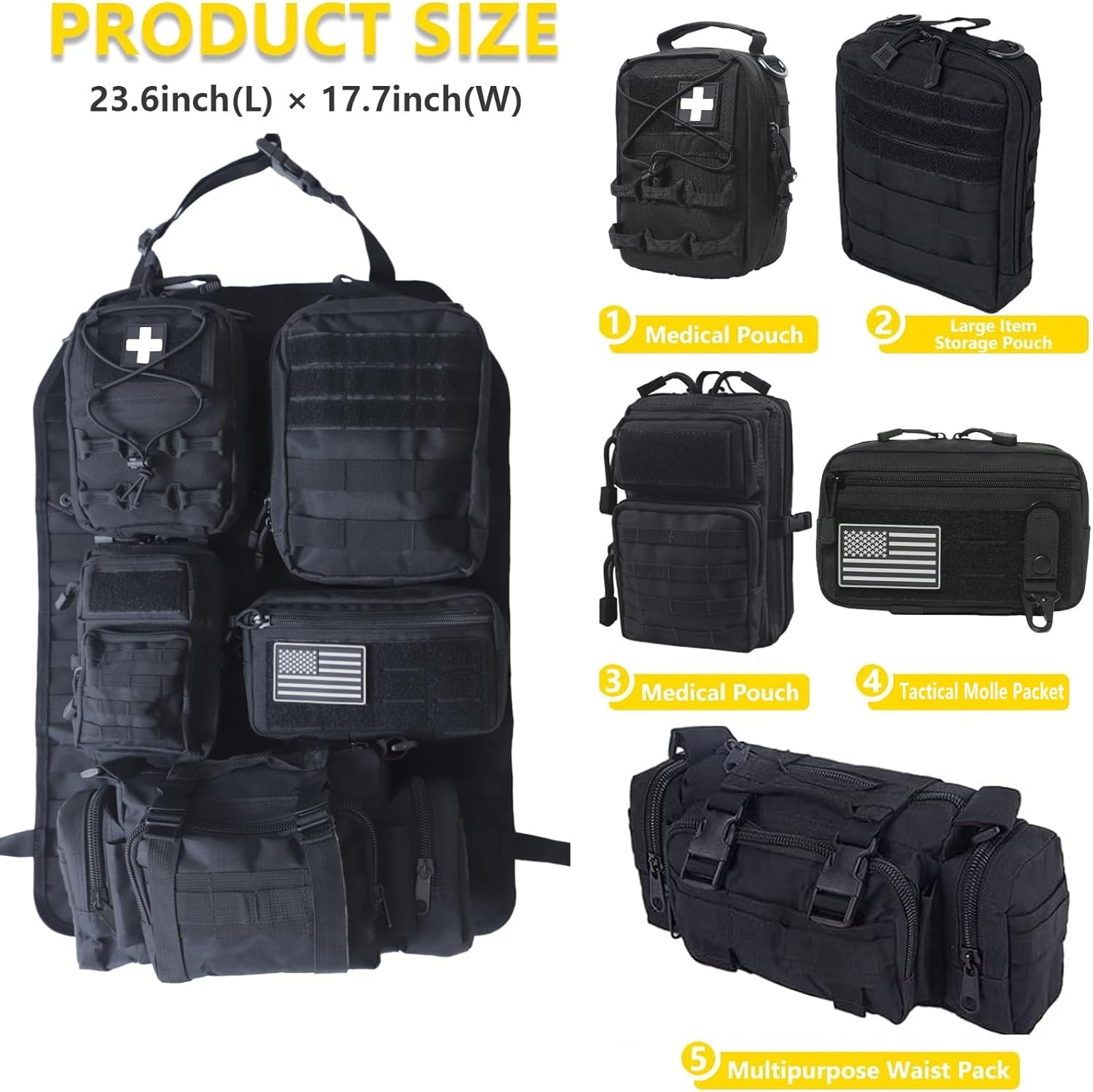 - 🚗 Multifunctional Storage - Design with 5 Molle bags on the back to help you store tactical gear & personal items and save space. Difference sizes of Molle bags help you classify your items so easily.you can set the Tactical Seat Back Organizer according to your own habits and need.