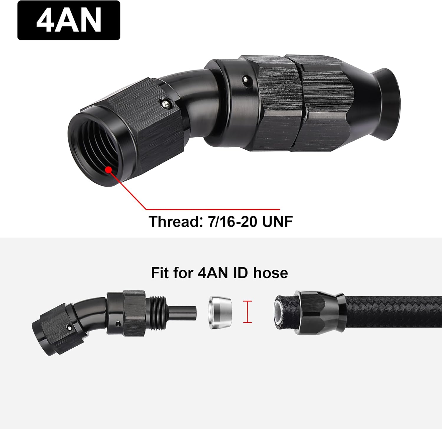- [Product Size & Parameter] Size: 4AN. Thread Size: 7/16-20 UNF. Working Pressure: 1500PSI. Working Temperature Range: -40°F-250°F. Angle: 30 Degrees. Note: Please verify the hose size before purchase.