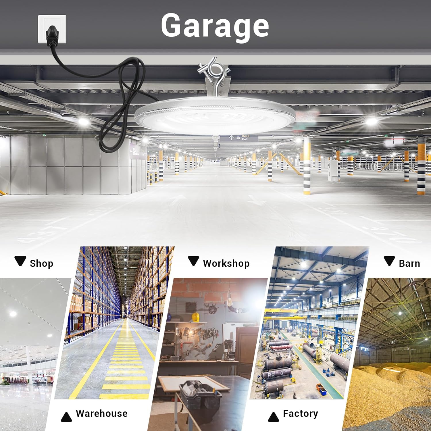 - 【Durable/Long Service Time】This UFO LED high bay light adopted high quality non-flickering driver ensure it over 50,000hours lifespan. It comes with an die-casting aluminum shell which features great thermal conductivity, these make the light durable and excellent heat dissipation. for workshops, barn, gymnasiums, factories, exhibition halls, shopping malls, supermarkets, storage yards, basements and any other large commercial and industrial places
