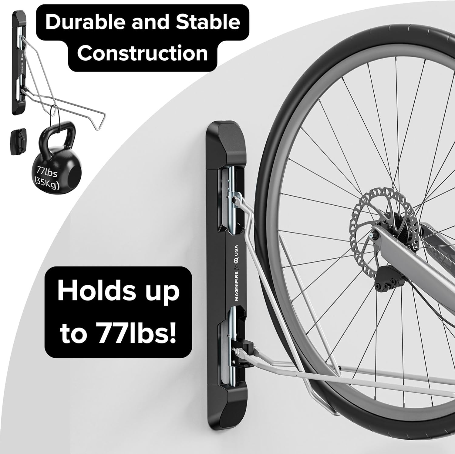 - Built Strong - Made with durability in mind, this alloy steel bike holder can hold up to 77 pounds (35 kg), making it the perfect bike storage rack for most home bicycles.