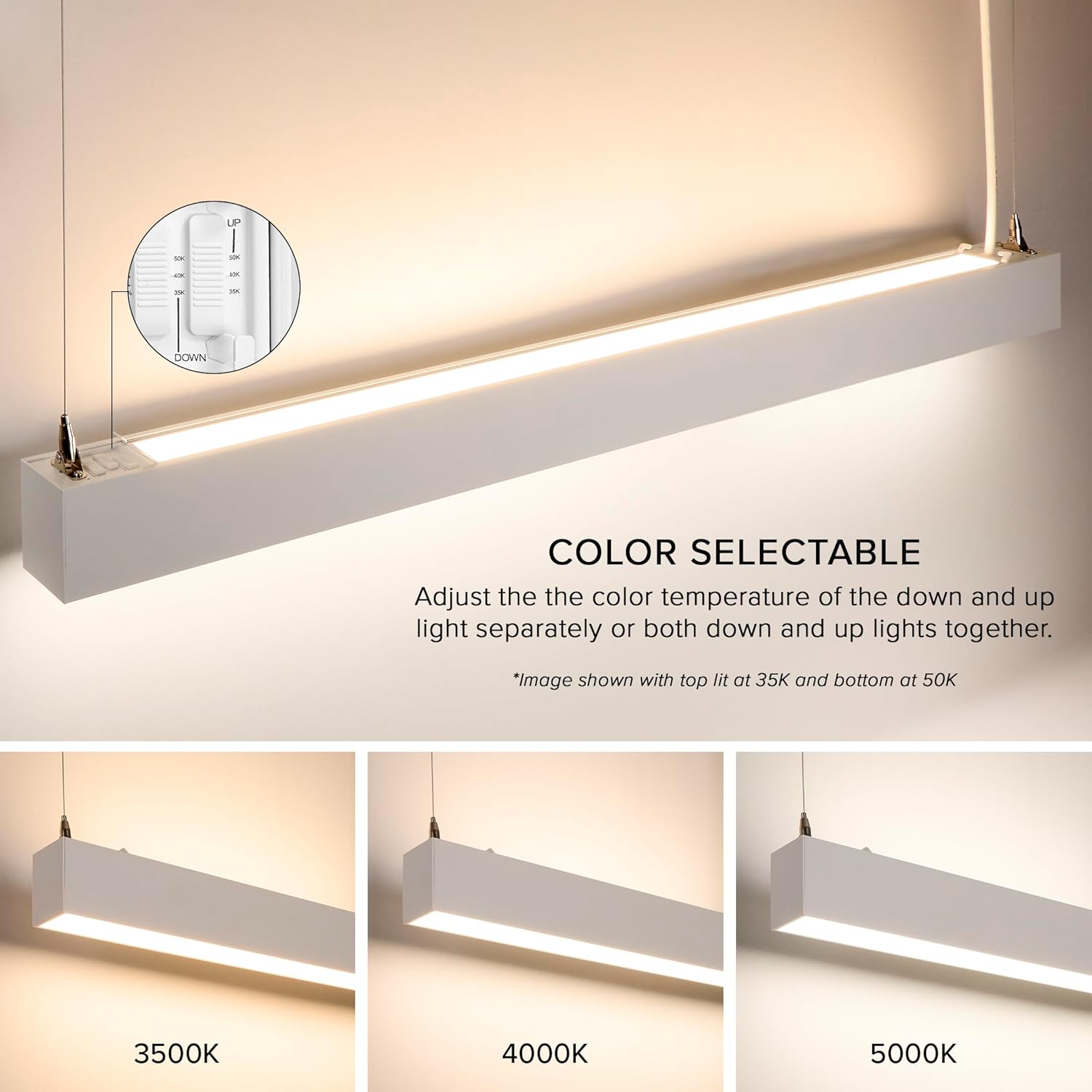 - Customizable Color Temperatures: Easily select from 3500K (bright white), 4000K (neutral white), or 5000K (daylight) with the CCT switch for perfect ambiance. The indirect and direct light are independently tunable.
