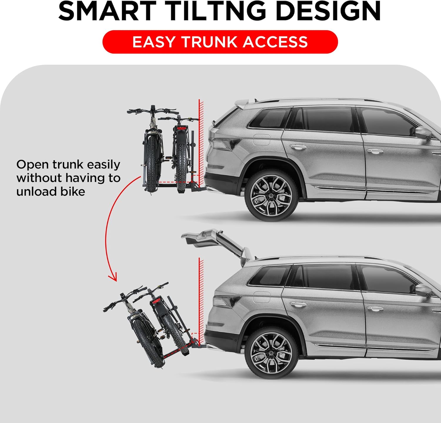 - SAFE AND SECURE ON OFFROAD: Comes with 2-arm fix, Anti-falloff 360° swirl structure and anti-wobble structure, that secure your E-bikes in place without swaying and knocking against vehicle.