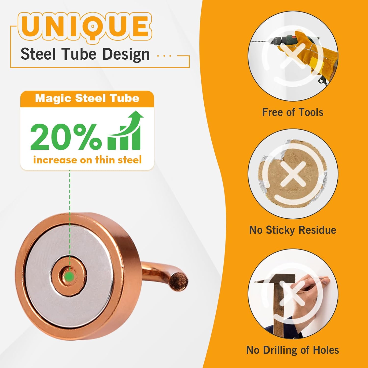 - ✔MAGIC STEEL TUBE DESIGN - Unique design of steel tube inside the base of magnetic hooks greatly increases the attractive force , especially on thin steel! It increase approximately 20% force comparing those none-tube magnets. it solves the problem of weak force on thin steel. Permanent magnetic hook with magic steel tube, strong magnetism lasts forever!