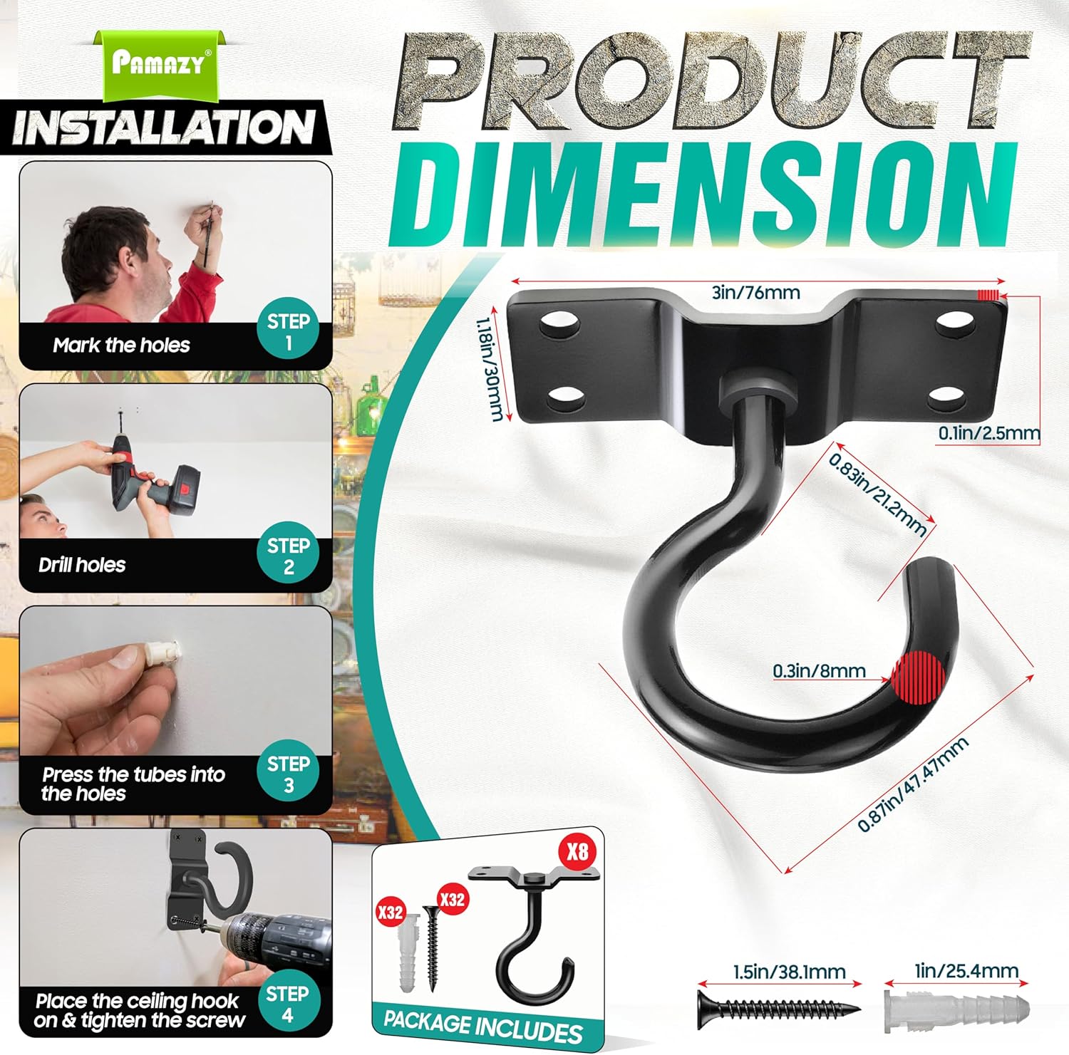 - [Easy To Install & Use] These ceiling hooks are simple to install; just drill holes in the wall, install expansion screws, and tighten the screws after installing the hooks. It can be assembled on the ceiling, brick, wood, and concrete walls, providing a perfect solution for hanging a range of items, including bird feeders, lanterns, plants, or decorations, making it a versatile accessory for any outdoor space. PACKAGE INCLUDES: 8 Ceiling hooks, 32 screws, and 32 expansion tubes.