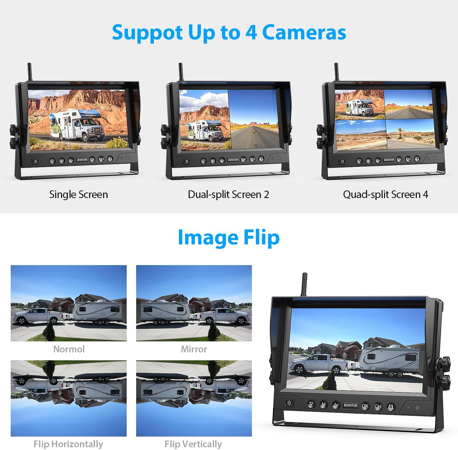 - 9" HD 1080P Monitor & DVR Loop Recording: The large 9-inch screen can display images in HD 1080P resolution with a clearer detail view. The rv backup camera system supports up to 4 cameras, which could be setup for dual/quad screen for multiple cameras monitoring at the same time. The system comes with 1 camera, if you need to add more cameras, please contact us to purchase separately. With the DVR loop recording, the system will automatically overwrites the old footages.