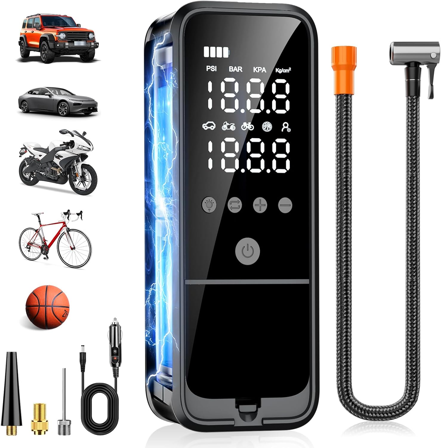 - [5+N Inflation Modes] The portable air compressor offers 5 preset inflation modes (Cars, Motorcycles, Bikes, Basketballs and Customization) and 3 preset units (PSI, KPA, BAR). The air pressure preset will automatically switch according to the change of inflation mode, easily set to your desired inflation mode.In addition, the extended 19.7-inch anti-scald and high-pressure hose can easily inflates from all angles and greatly improves the safety of inflation.