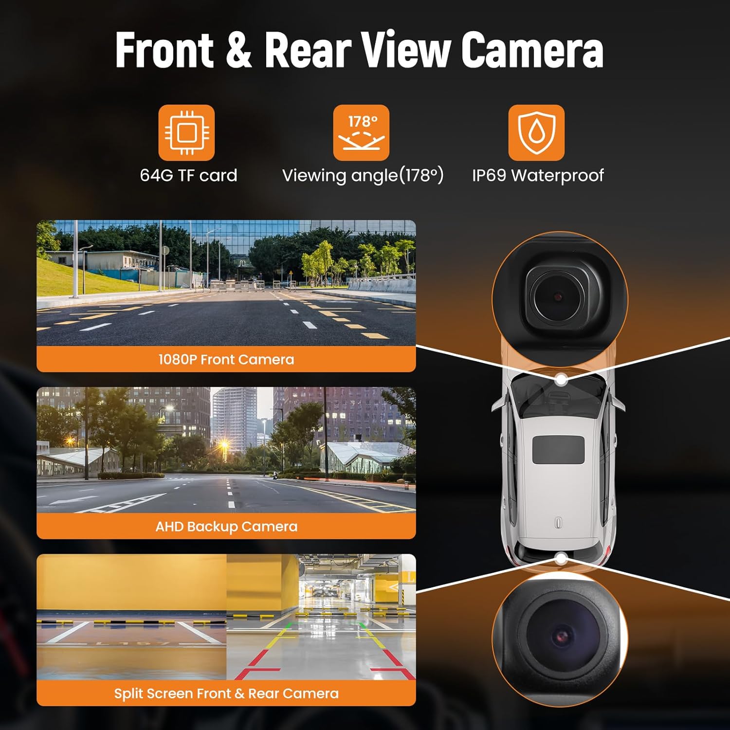 - ăDual Camera, Front & Rear RecordingăEquipped with a waterproof 2.5K HD front camera, an AHD rear camera, and 178° full-viewing angle. The front and rear views can be displayed in split screens, making it safer and more efficient when reversing. 64GB TF card, the system automatically enters loop recording mode after inserting the card. No more worries about memory issues