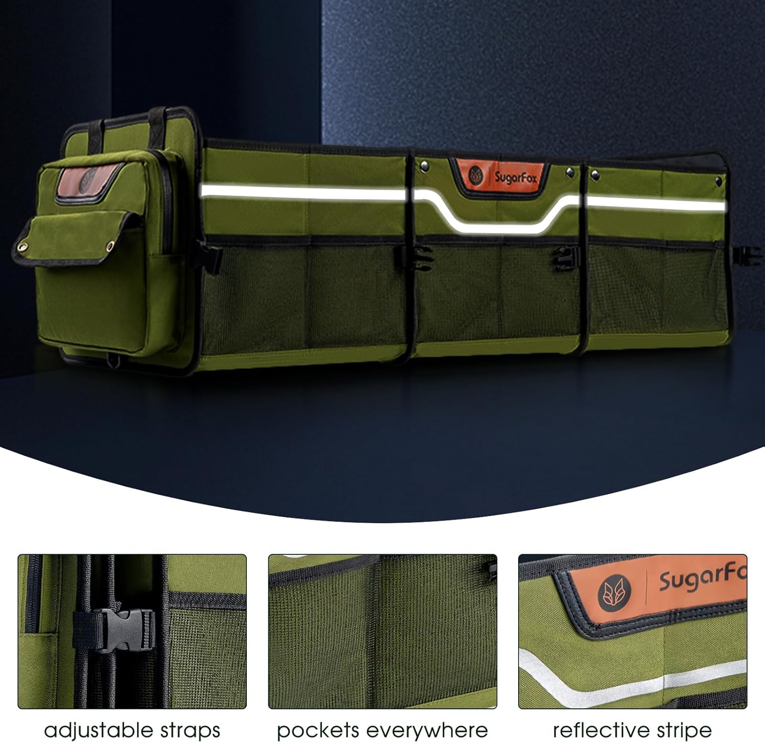 - Unique Material Combination: The trunk organizer is made of oxford cloth, leather, reflective strips, and metal buckles. The combination of these different materials shows a unique aesthetic of material collision, not only practical but also adding a touch of style to your car