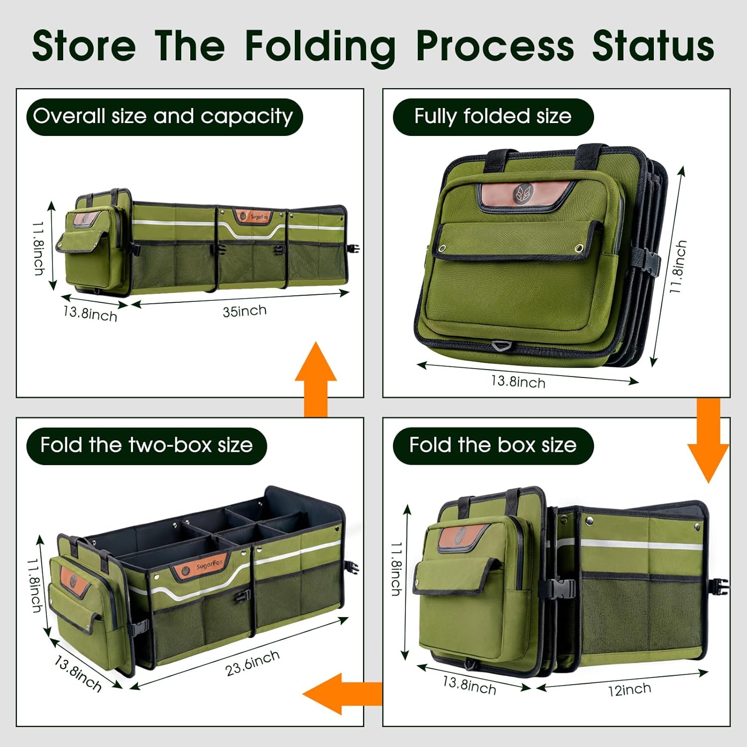 - Spacious & Well-organized: It's a great storage solution for car trunk. With dimensions of 35" x 13.8" x 11.8"(96L), it offers a large storage space with compartments of different sizes and multiple large pockets on the sides. The top is a soft-mesh cover, allowing you to store taller items. You can easily categorize and access your belongings, keeping your trunk neat and tidy. Plus, it's also a collapsible storage bin for your car