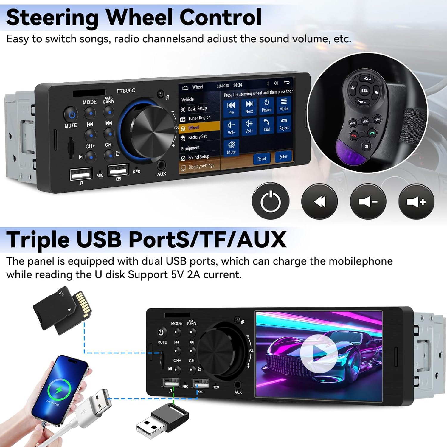- FM Radio & Media Playback: 1 din Bluetooth car media player with high quality digital stereo FM tuner(87.5 ~ 108.0 MHz), 3 bands (FM1-FM2-FM3), can do 18 stations to save. You can listen to music, weather forecasts,newsletters and traffic information while driving. Support AUX/USB/TF card for audio/video input to this radio receiver, and support USB fast charging phone via USB jack