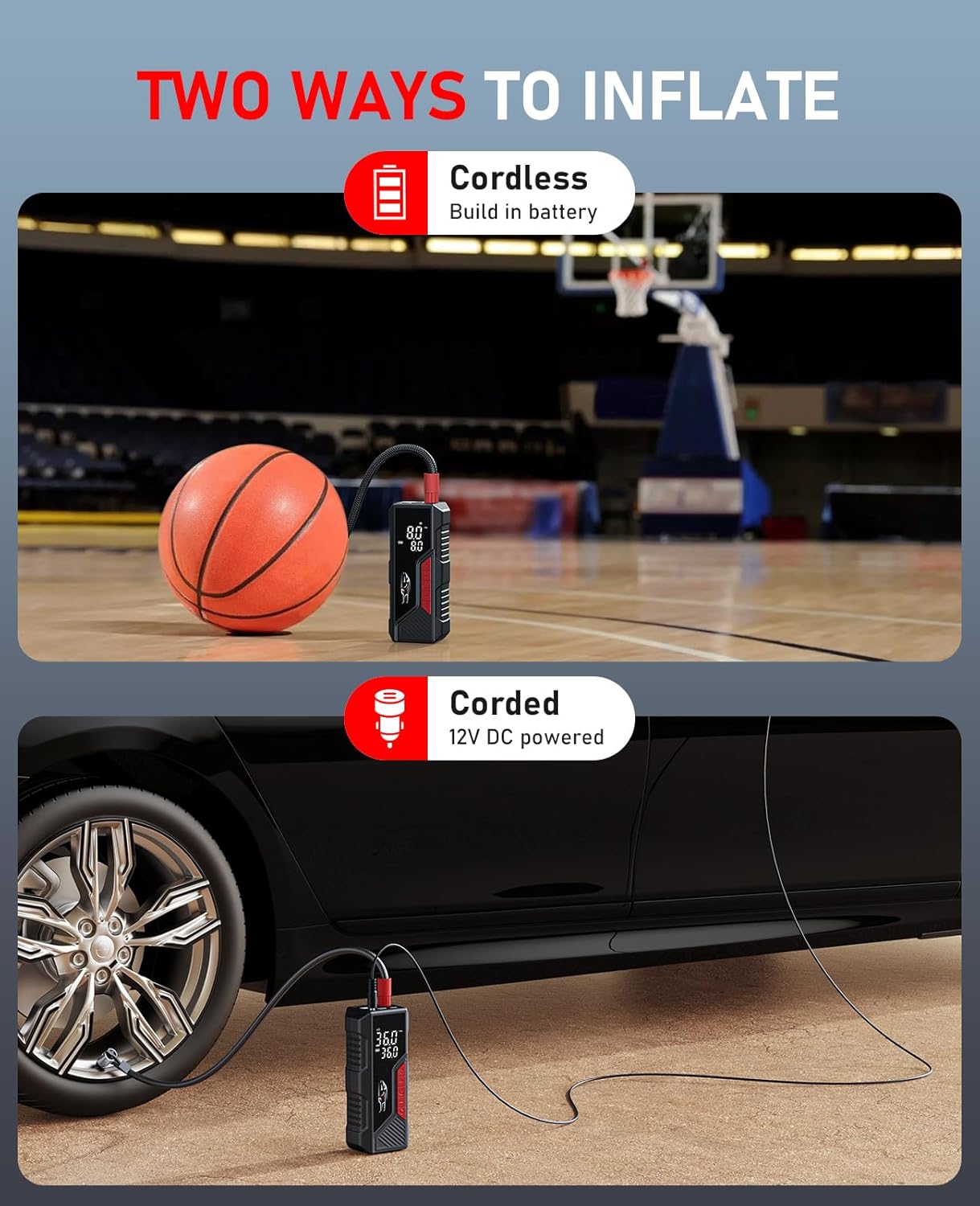 - Compact & Versatile Design – Weighing just 1 pound, this lightweight and portable mini air pump easily fits in your car, backpack, or garage. A must-have for drivers, cyclists, and sports enthusiasts, it’s perfect for inflating tires on road trips, sports balls at the park, or gear for outdoor adventures. Stay prepared for any situation with this compact yet powerful pump for cars, moto, e-bikes, bicycle, basketball and inflatables.
