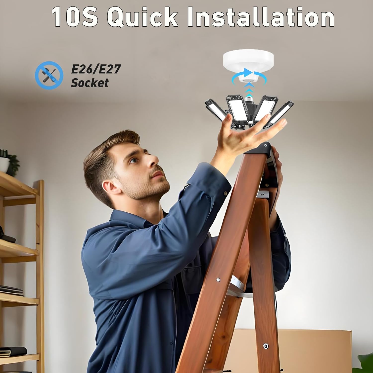 - 15S Quick Installation: Garage light bulb light universal E26/E27 screw plug and play, no need electrician wiring or tools, one person 15 seconds three-step installation: power off - corresponding base rotation screw in - light up, save time and effort