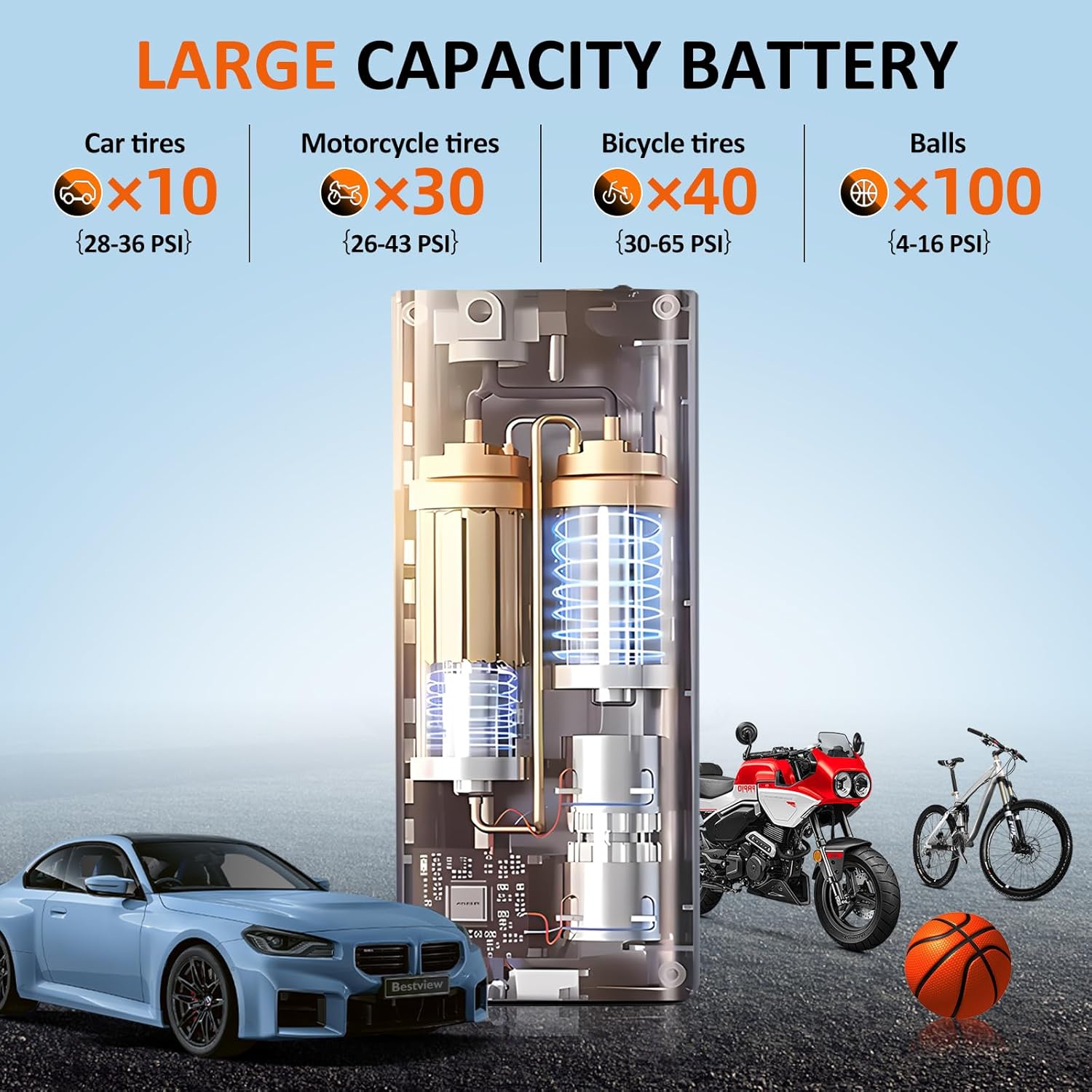 - ✅【Fast Inflation】: Bestview portable air compressor has a built-in 16000mAh rechargeable battery, fast inflation speed, up to 35L/min, 4 times faster than other ordinary electric air pumps, 35% more power. Whether your tire is a car, bicycle, motorcycle tire or a sports ball, this air compressor can quickly get it back to normal.
